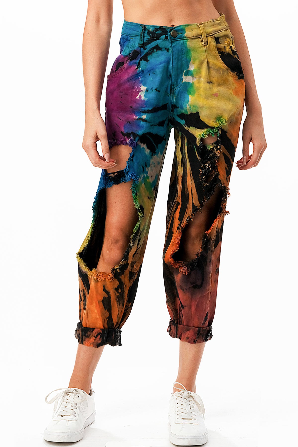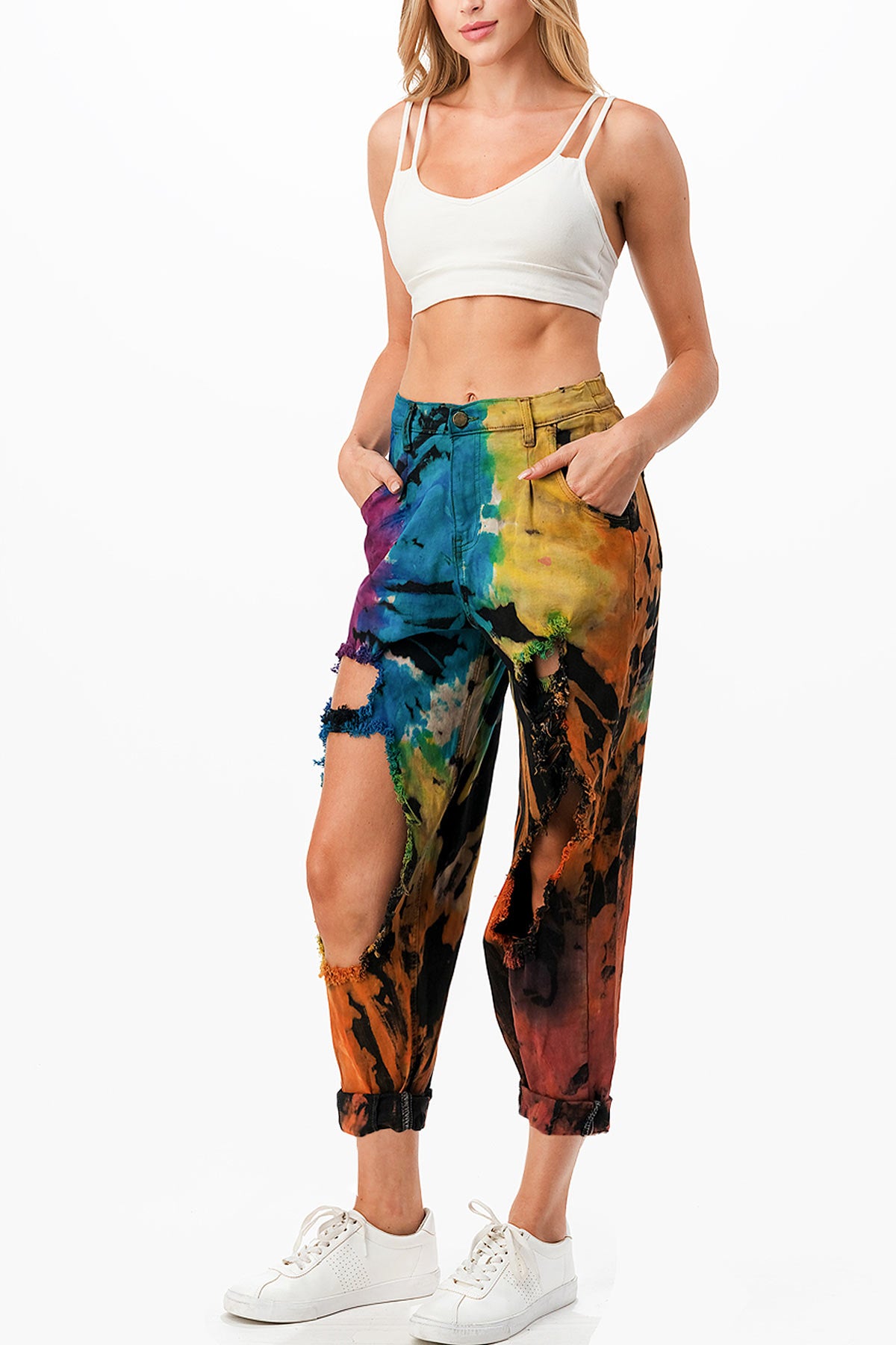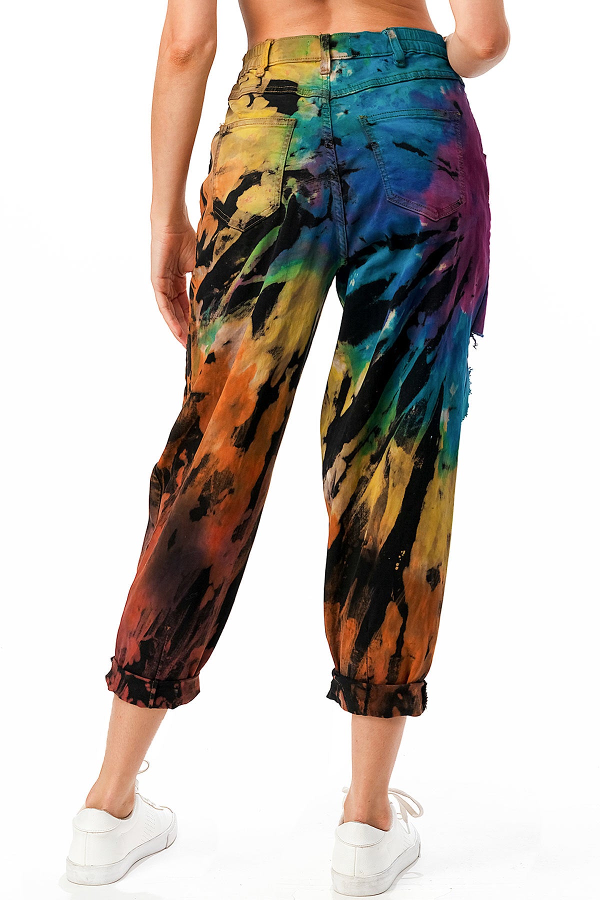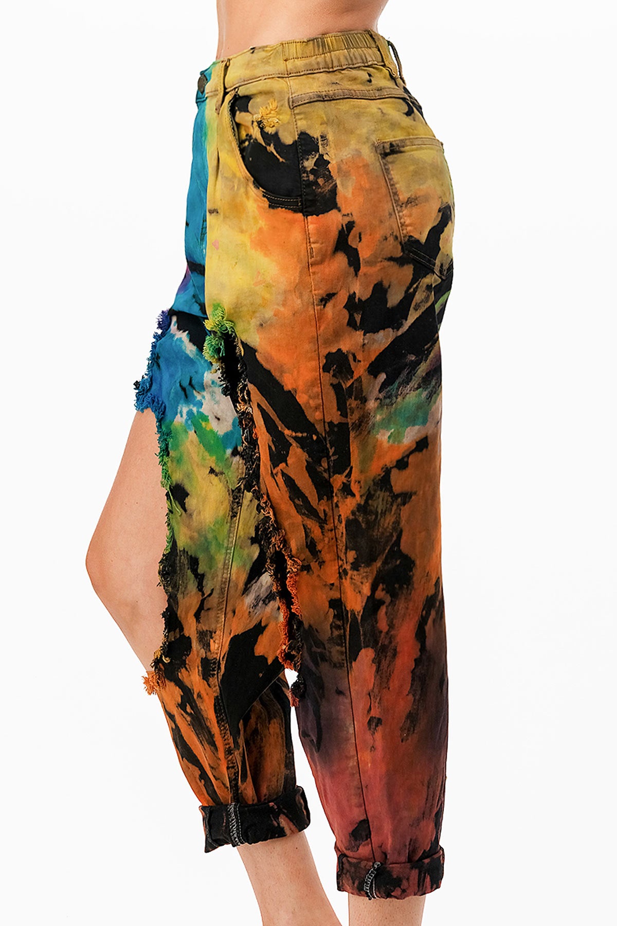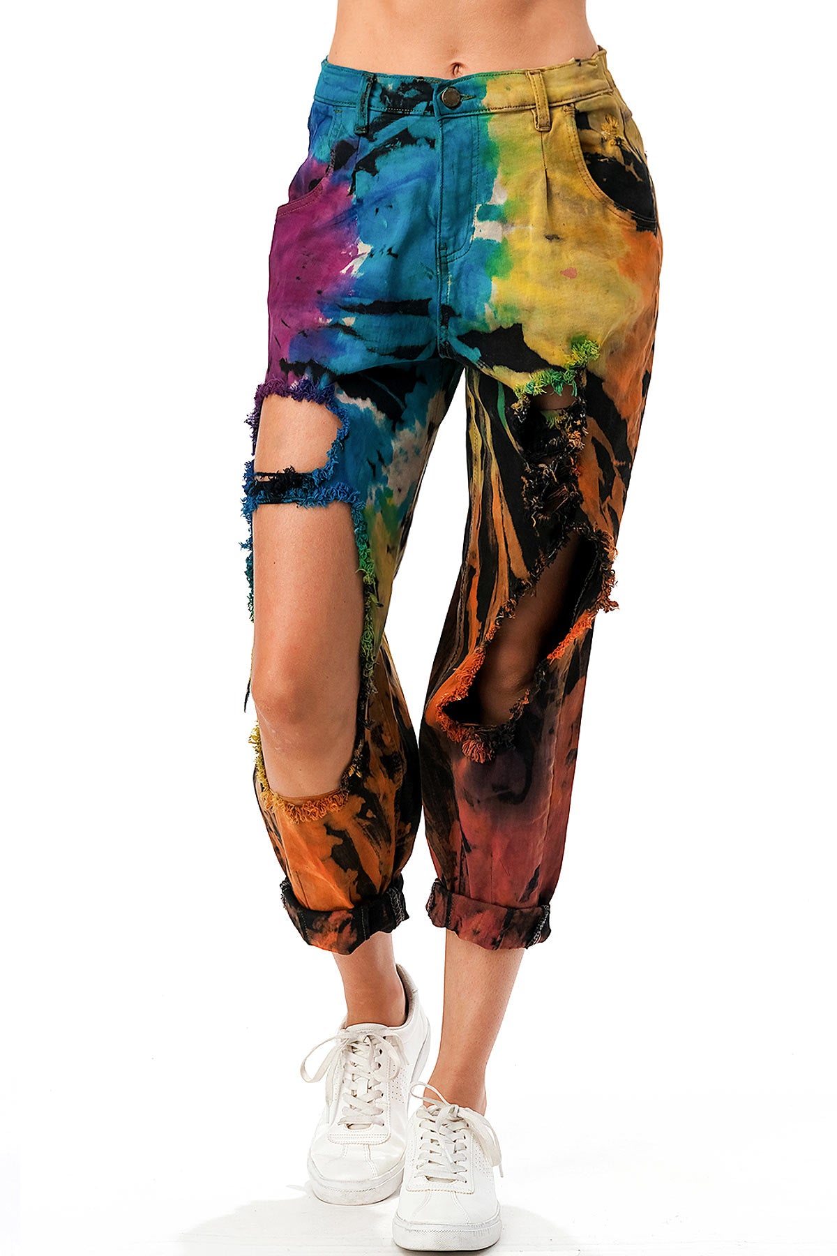 Make a statement in these pants with vibrant dyed colors and heavy distressing. Trouser-inspired silhouette that loosely drapes and tapers at the ankle. Light and stretchy fabric with an elastic waistband for comfortable all-day wear. Zip fly and button closure, side and back pockets, and cropped inseam. This style is truly one of a kind. Each item is individually dye and will have variations in color placement. Runs big.