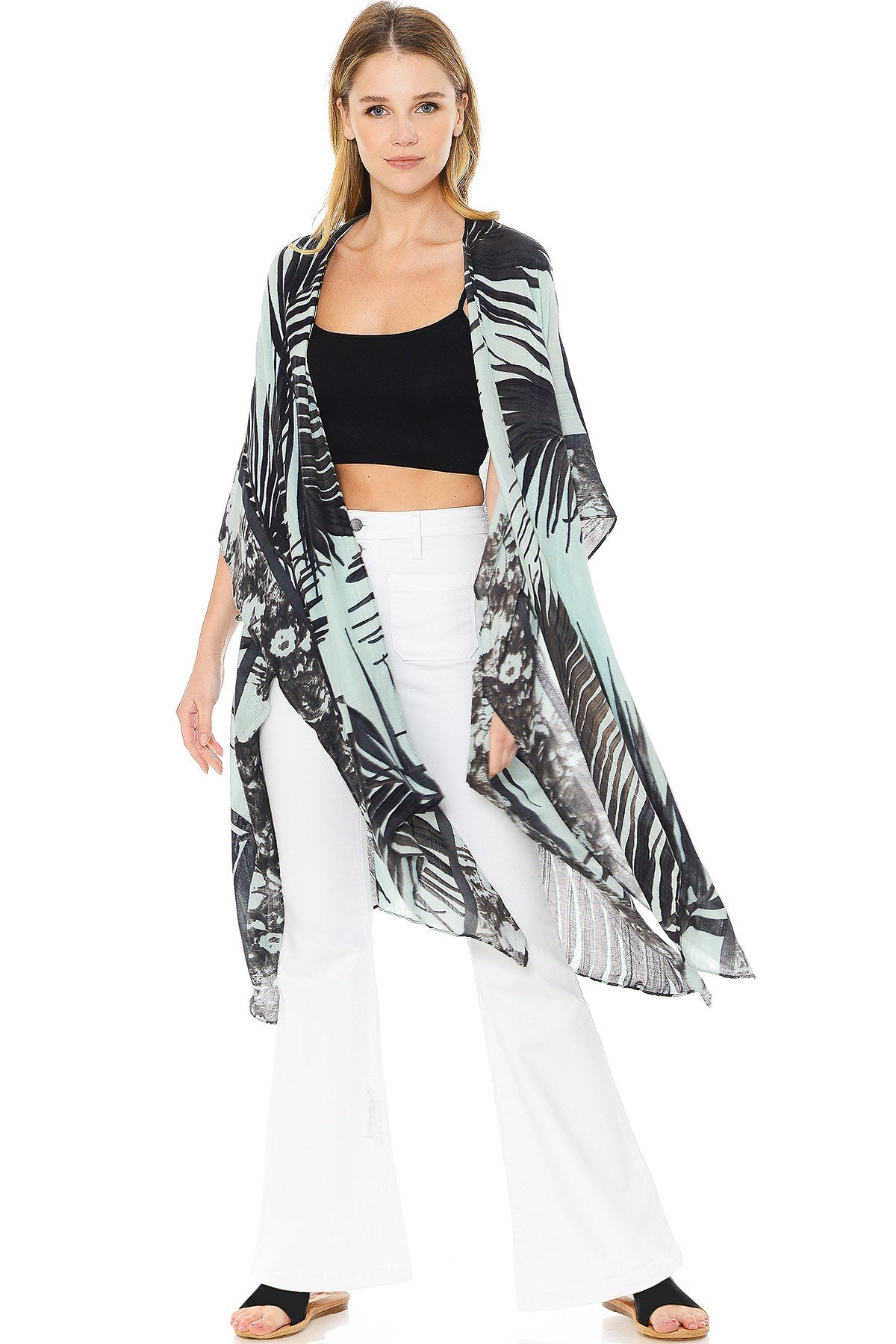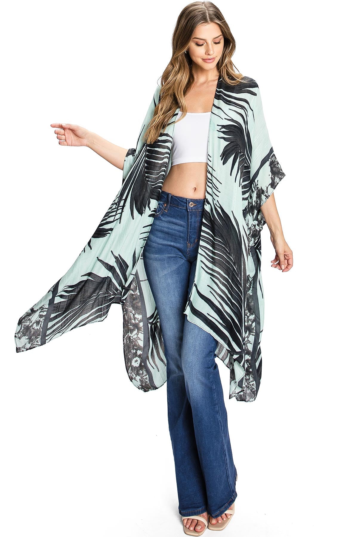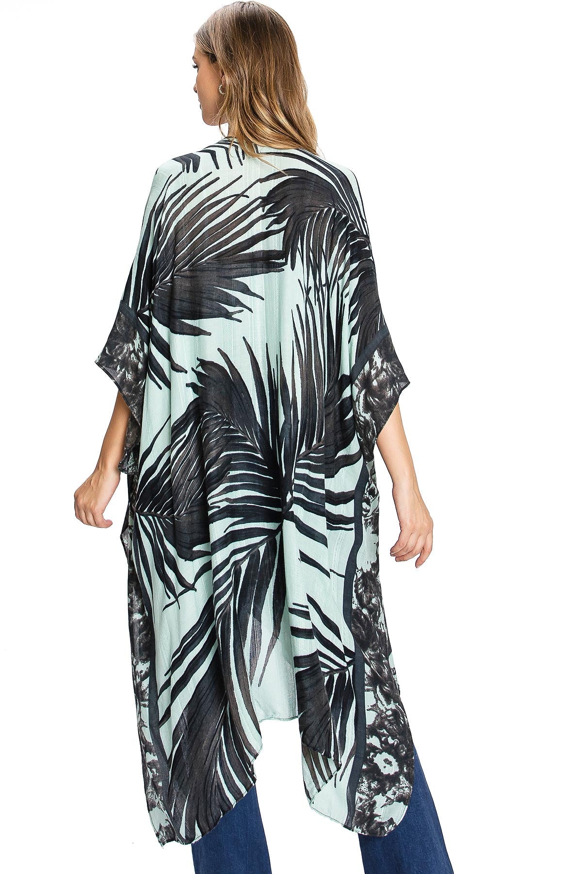 Airy kimono cardigan featuring a bold, oversize palm leaf print. Draping silhouette with 3/4 length kimono sleeves. Super soft and light weight fabric looks great layered with many different looks!