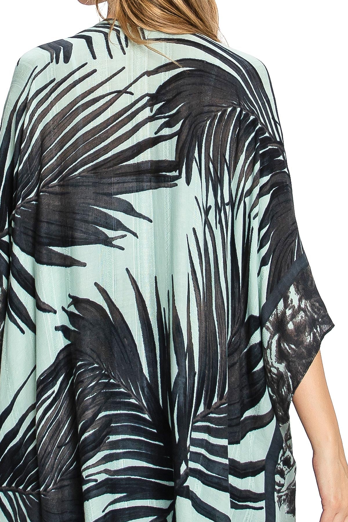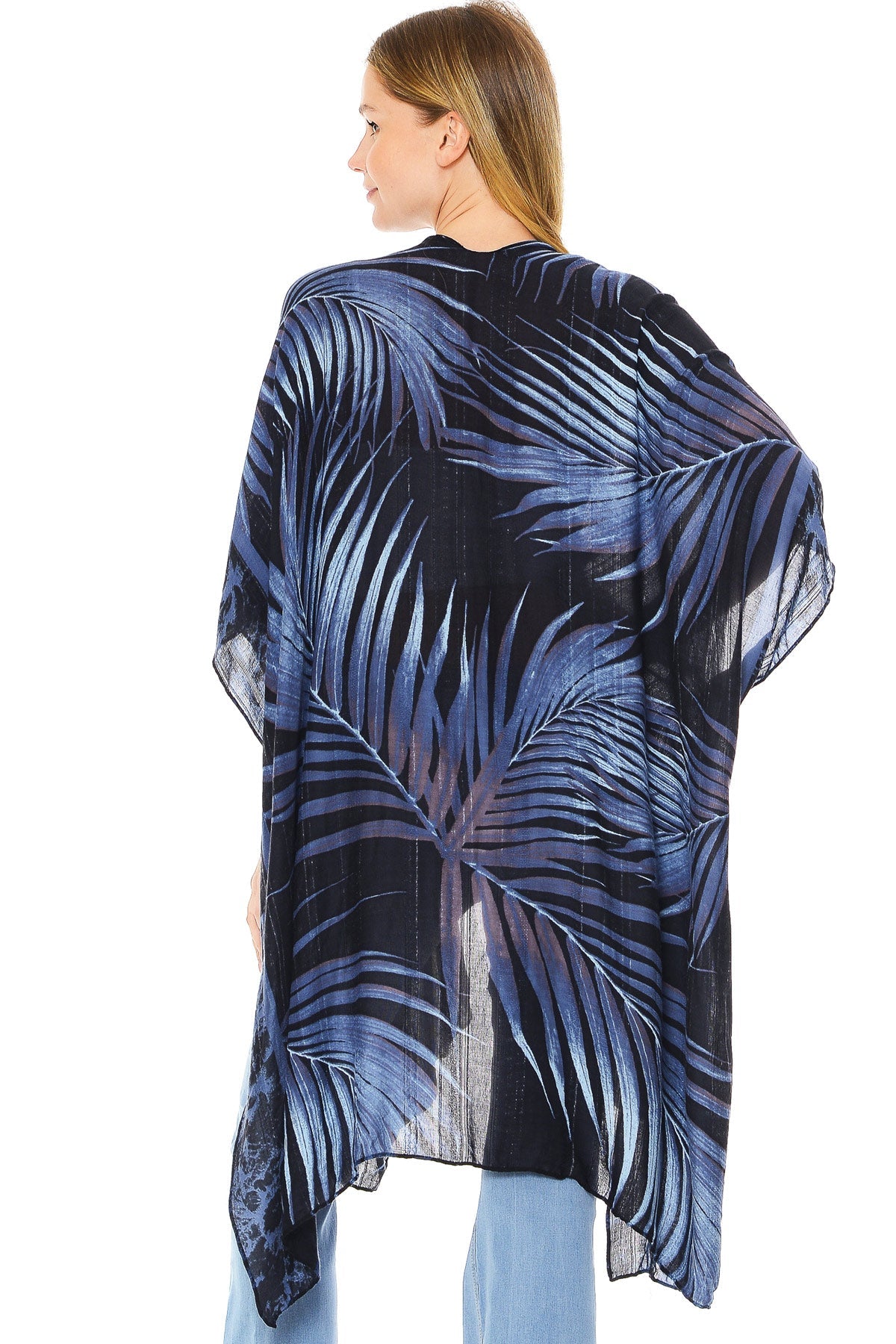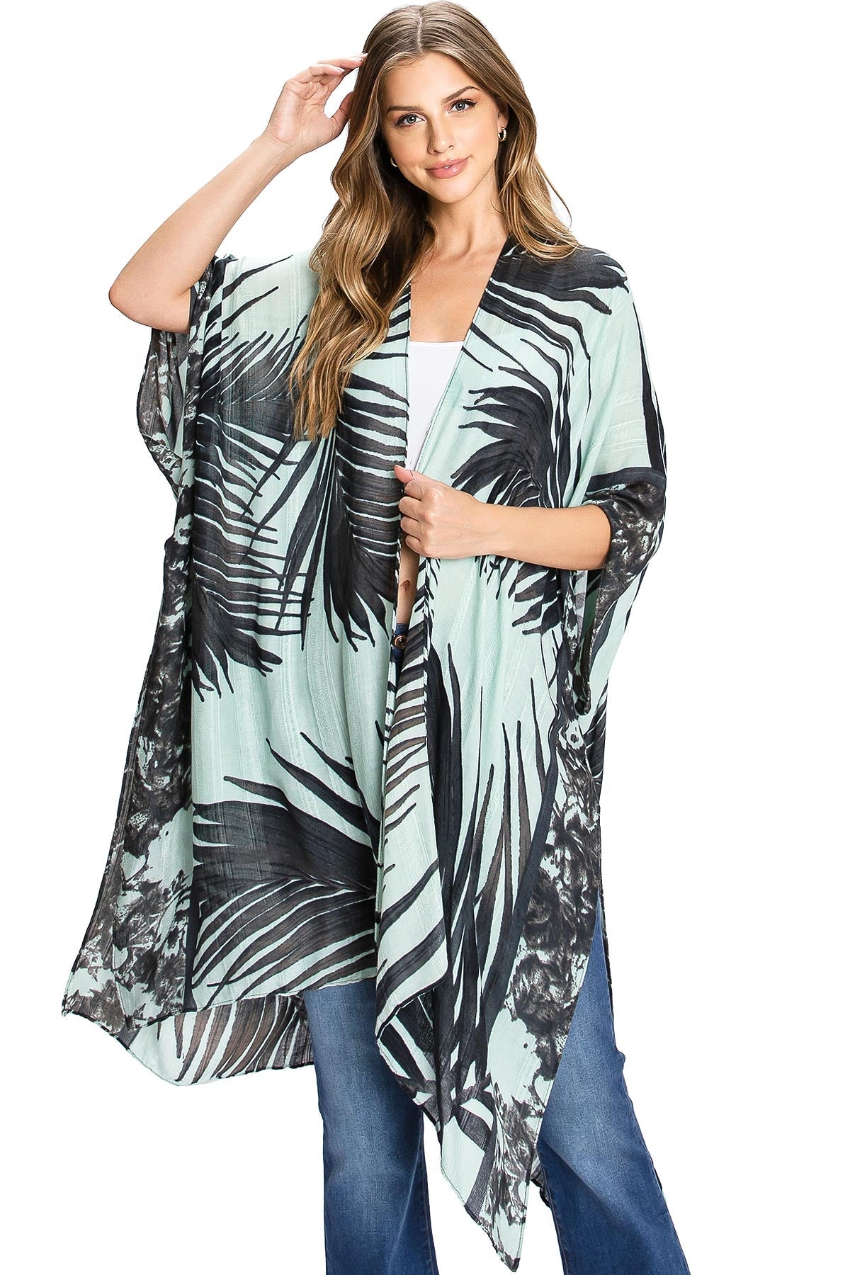 Airy kimono cardigan featuring a bold, oversize palm leaf print. Draping silhouette with 3/4 length kimono sleeves. Super soft and light weight fabric looks great layered with many different looks!