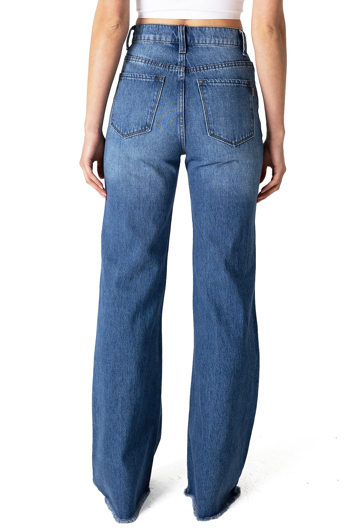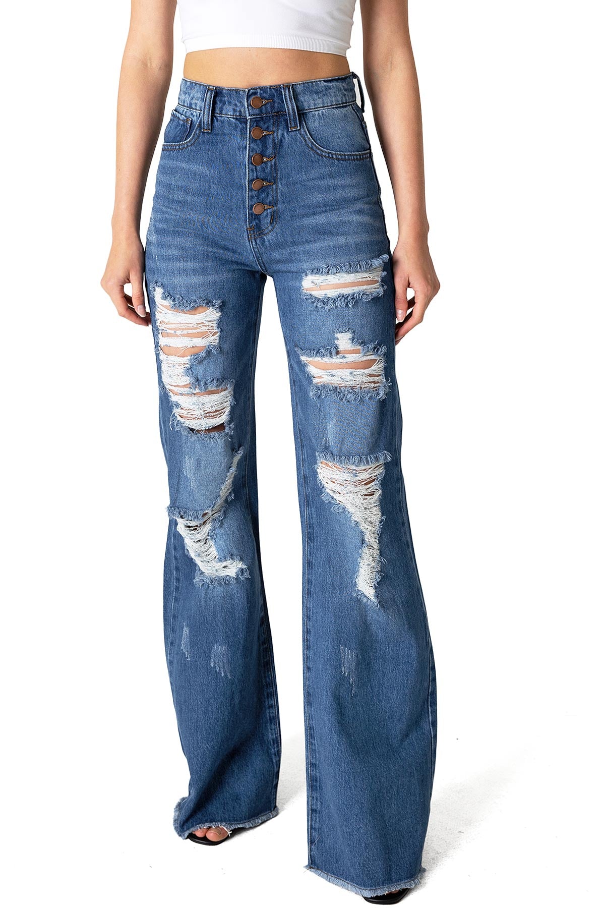 Wide-leg, denim pants with a high-rise fit, 5-pocket construction and an exposed button up closure. Heavy distressing down the front with a frayed hem. No stretch in denim. Runs small, sizing up is recommended.