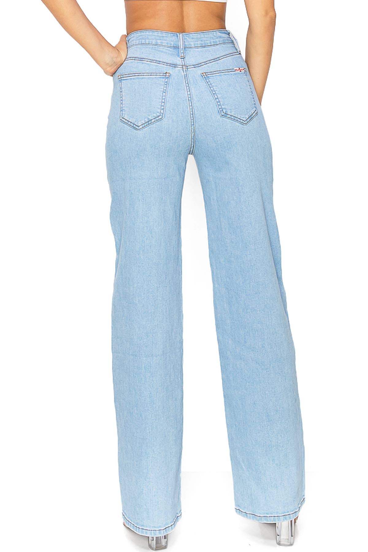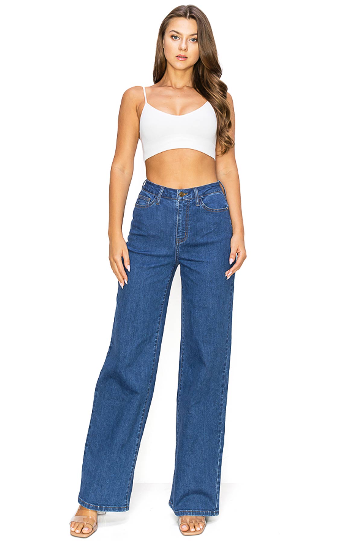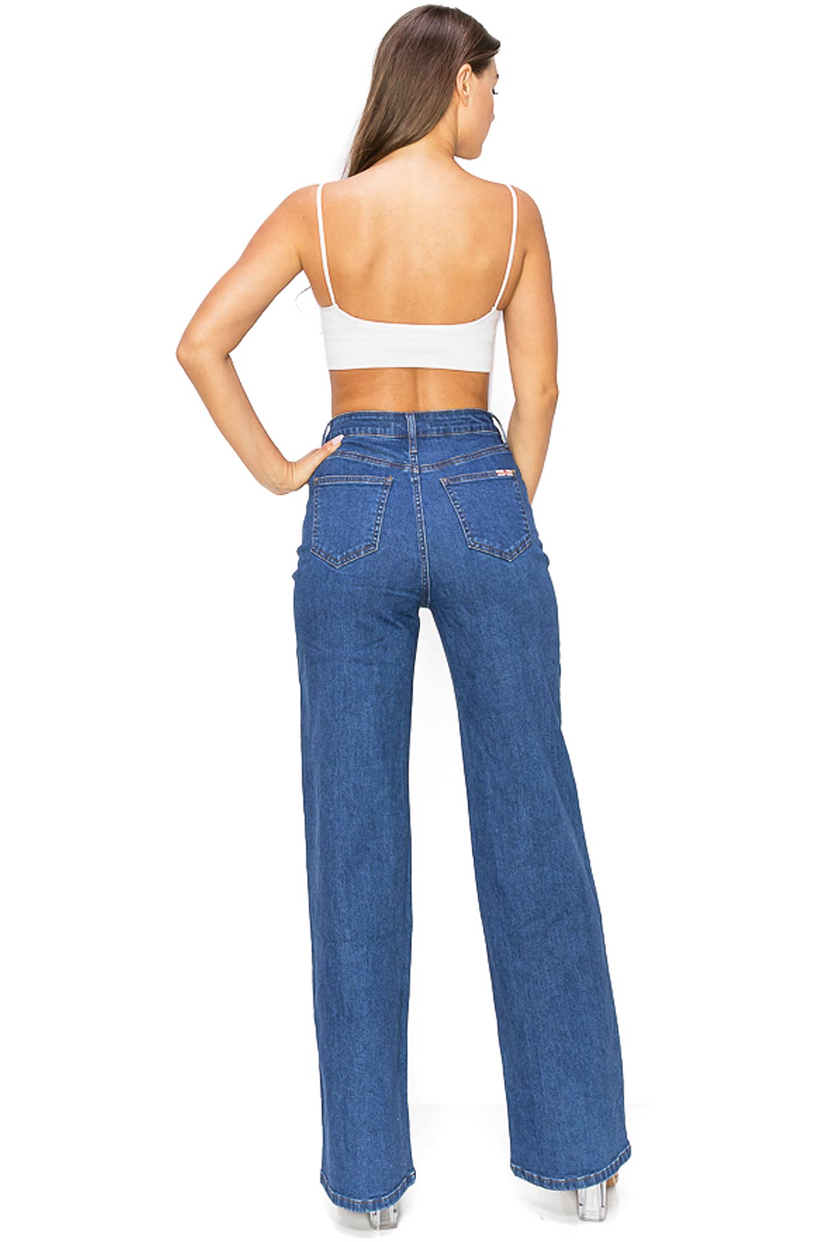 Wide-leg denim pants with a super high-rise fit and a 5-pocket construction and traditional zip fly and button closure. Stretchy, comfortable denim.