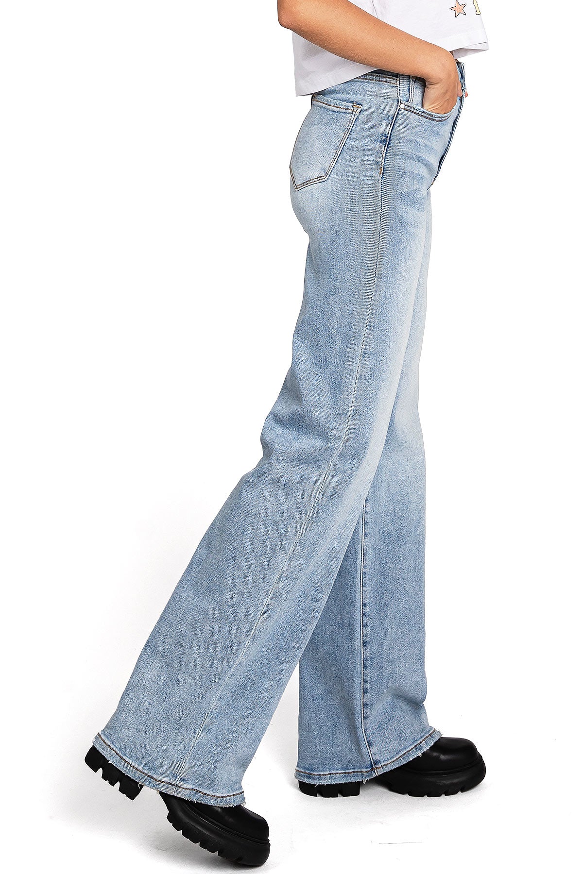Wide-leg, denim pants with a high-rise fit, traditional 5-pocket construction, zipper fly and button closure. Effortless and chic silhouette. Stretchy and comfortable denim.