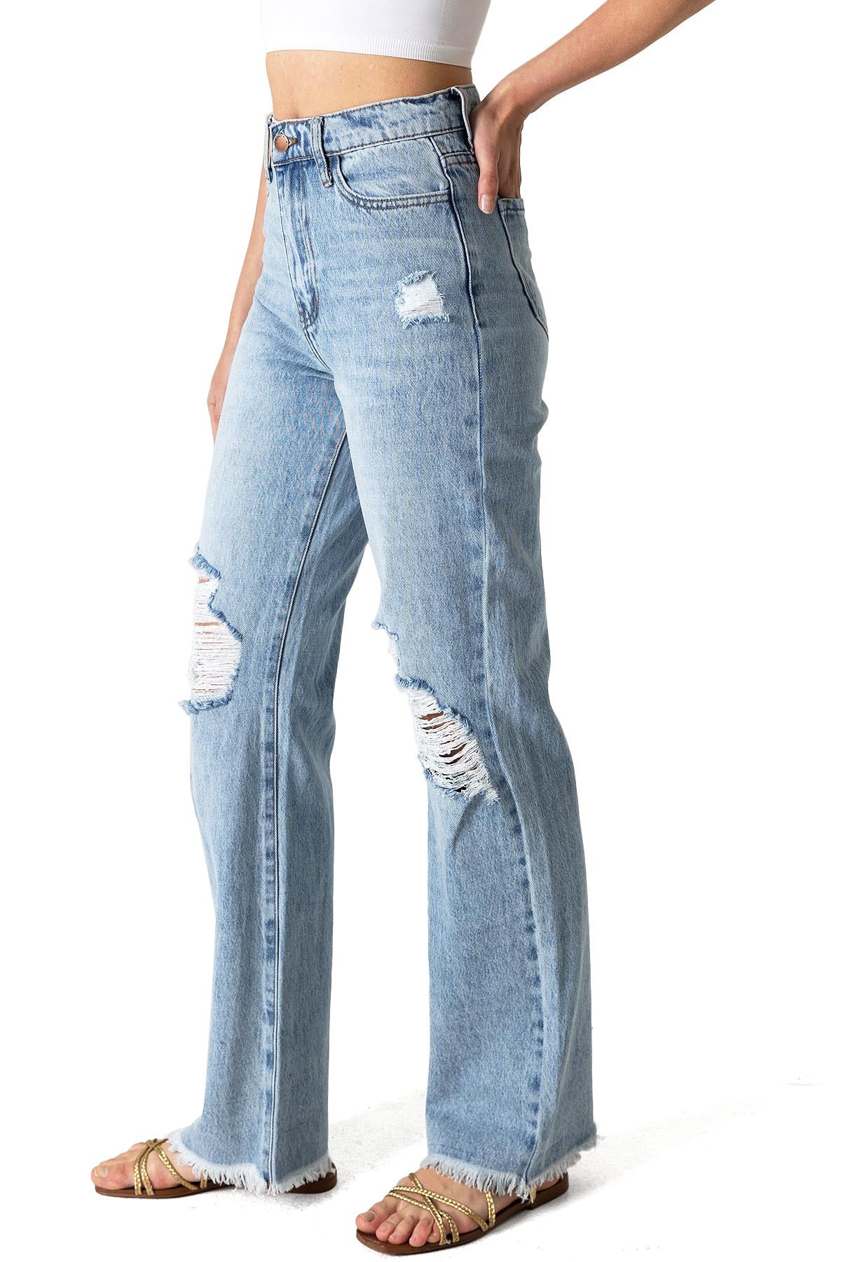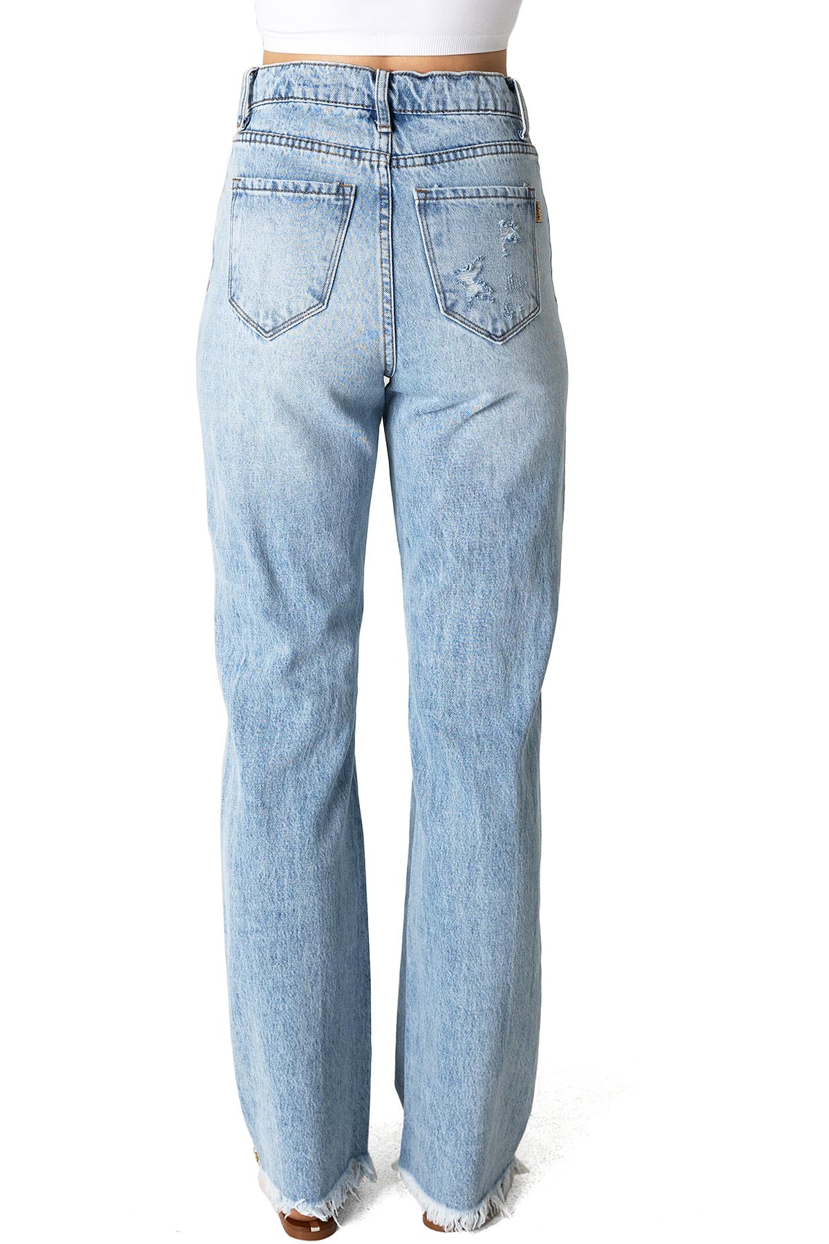 Straight-leg jeans with a nostalgic stonewash. Classic high-rise fit, 5-pocket construction and zip fly and button closure. Heavy shredding on the knees and a fully frayed hem. Non-stretch denim. Runs small, sizing up is recommended.