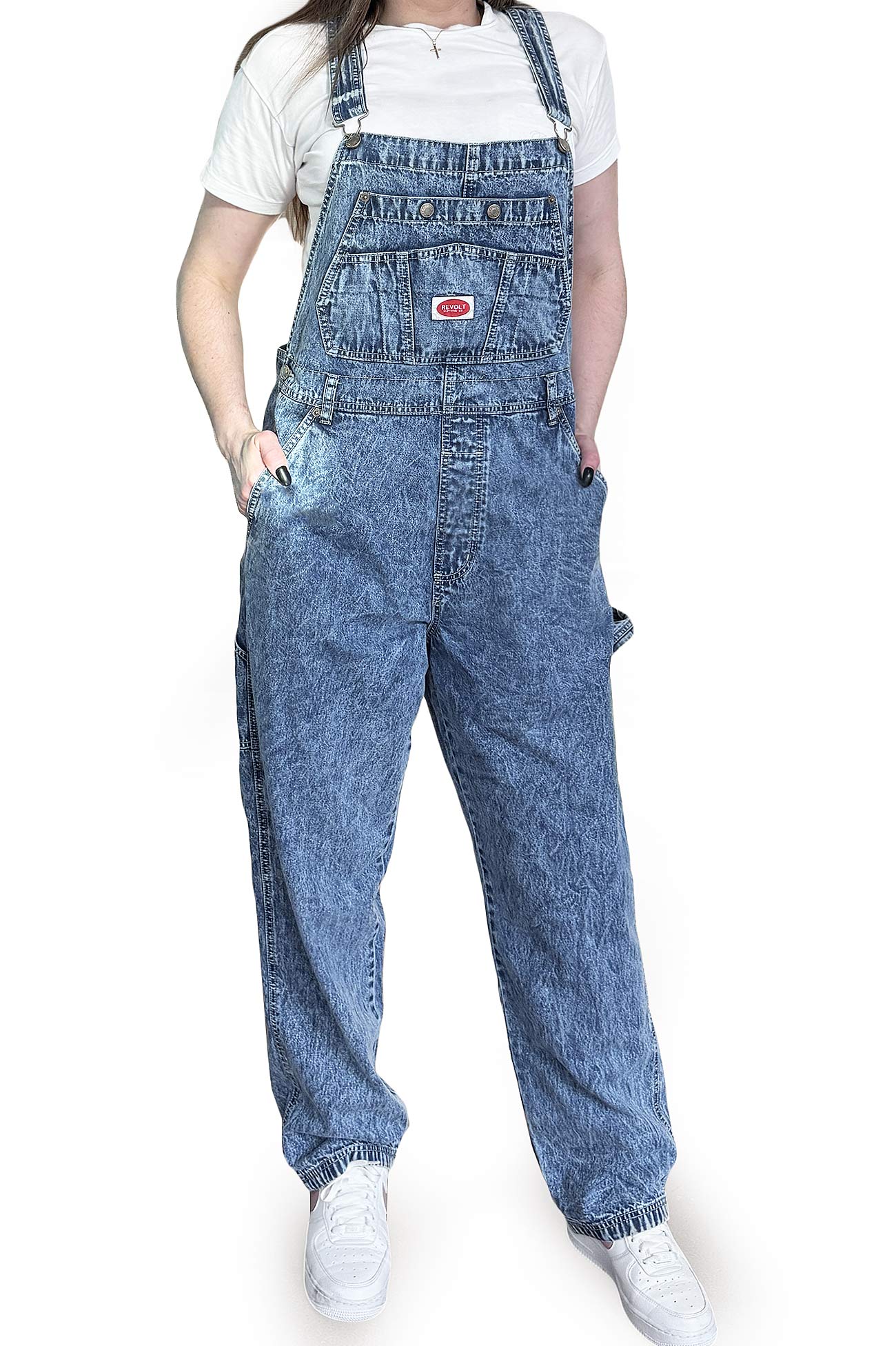 Classic twill canvas overalls with baggy straight leg fit. Traditional style bib with pockets on the chest and to the sides and button up closures on the sides.