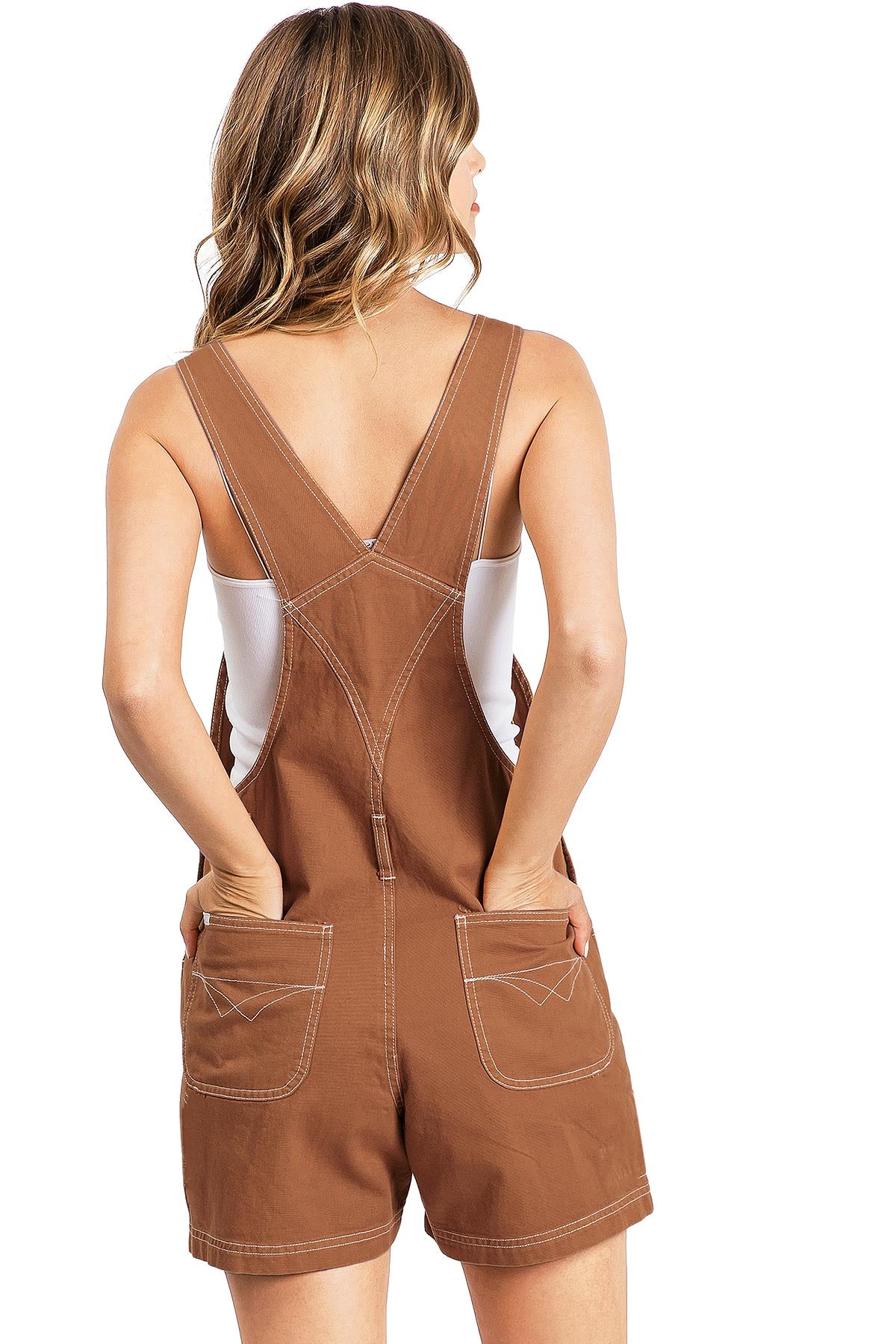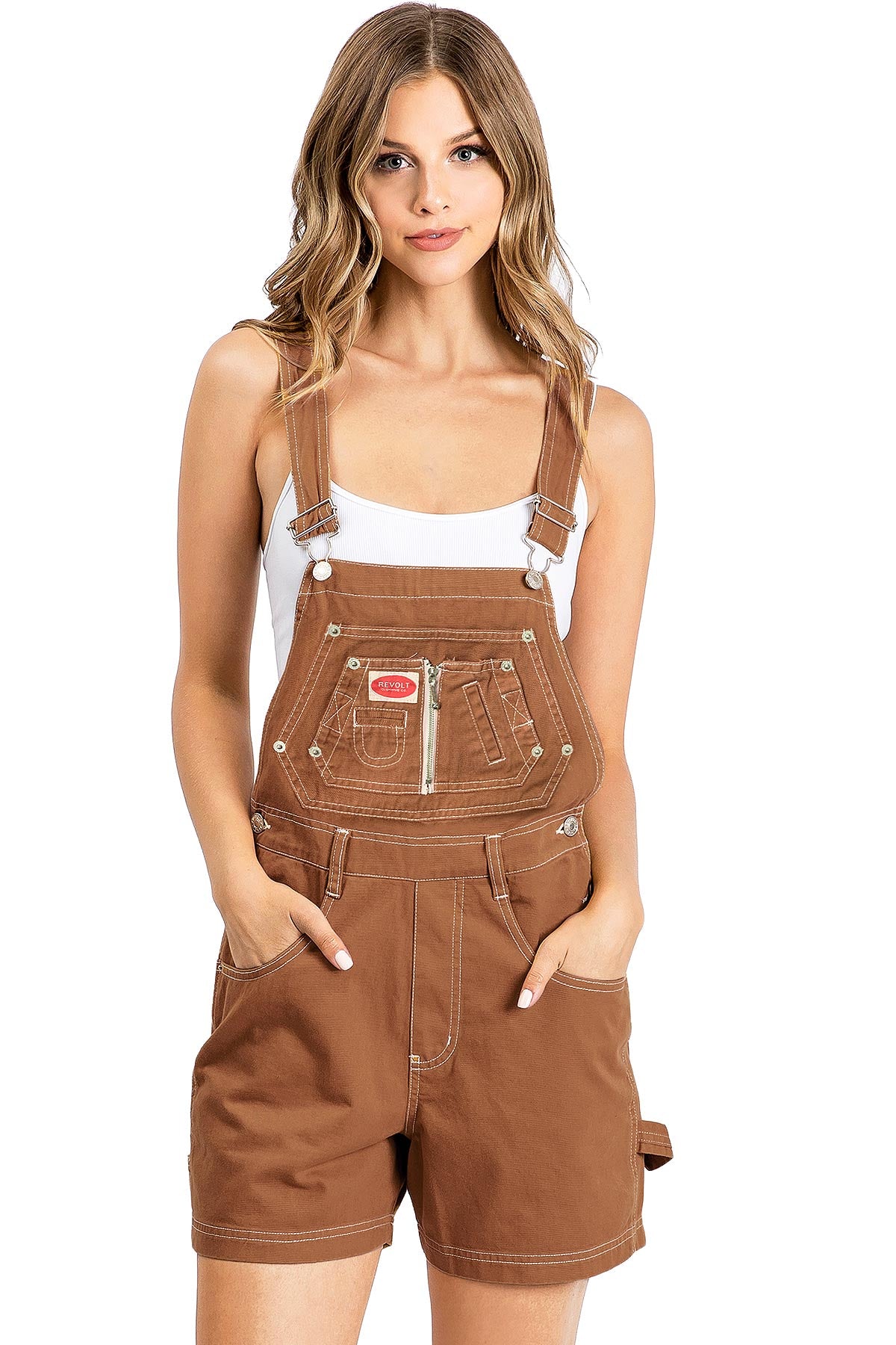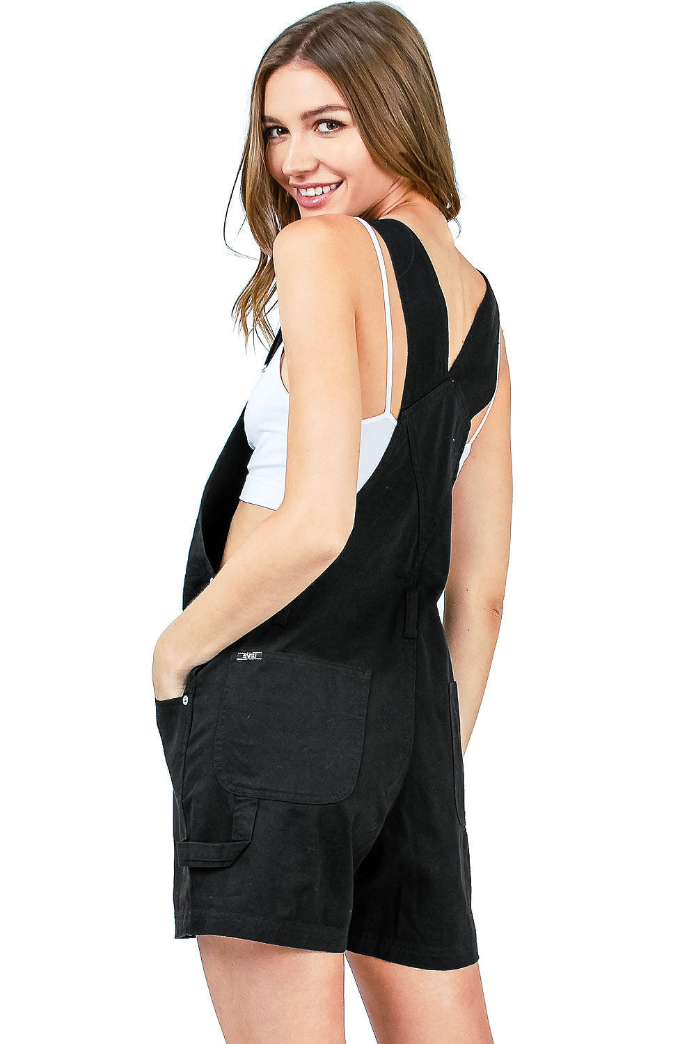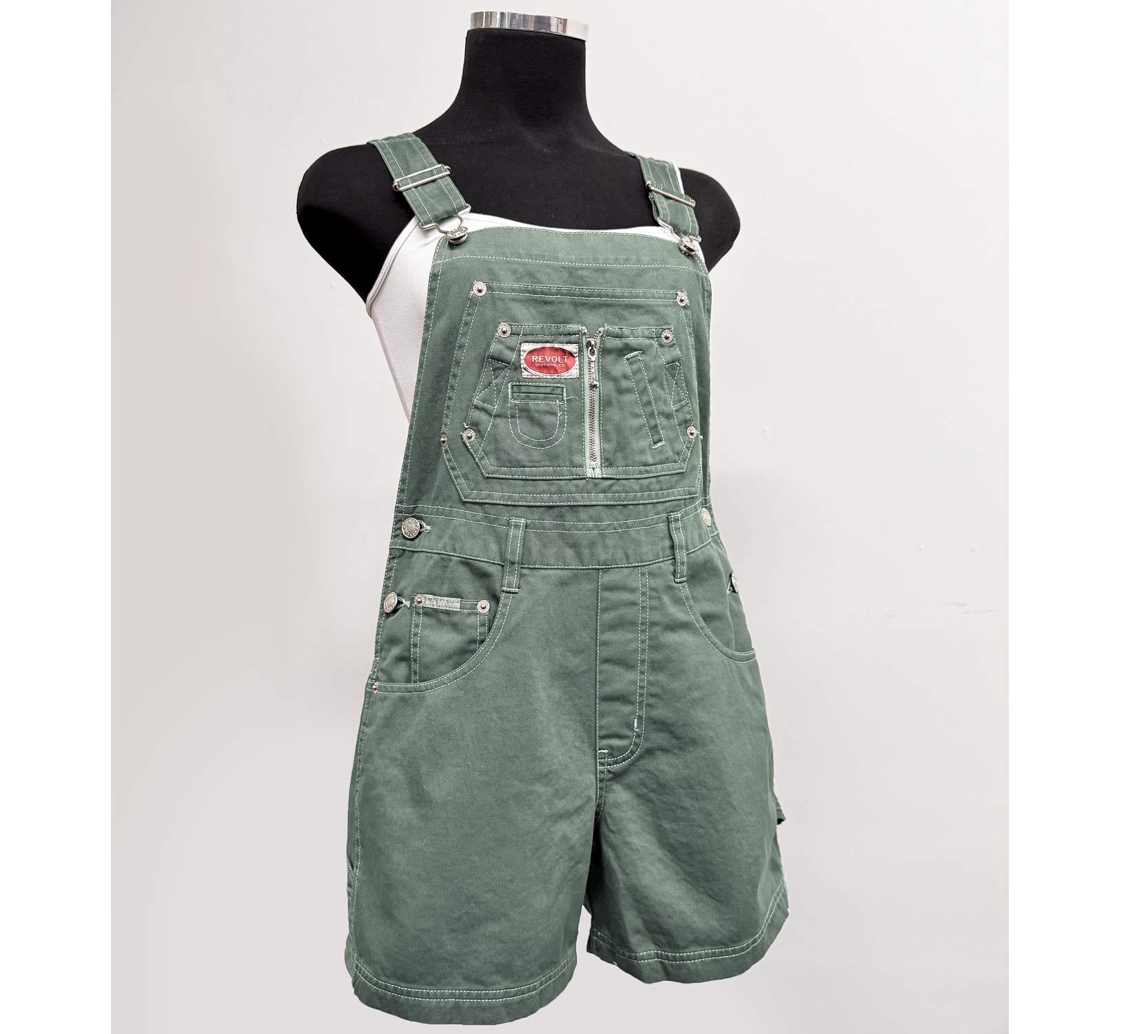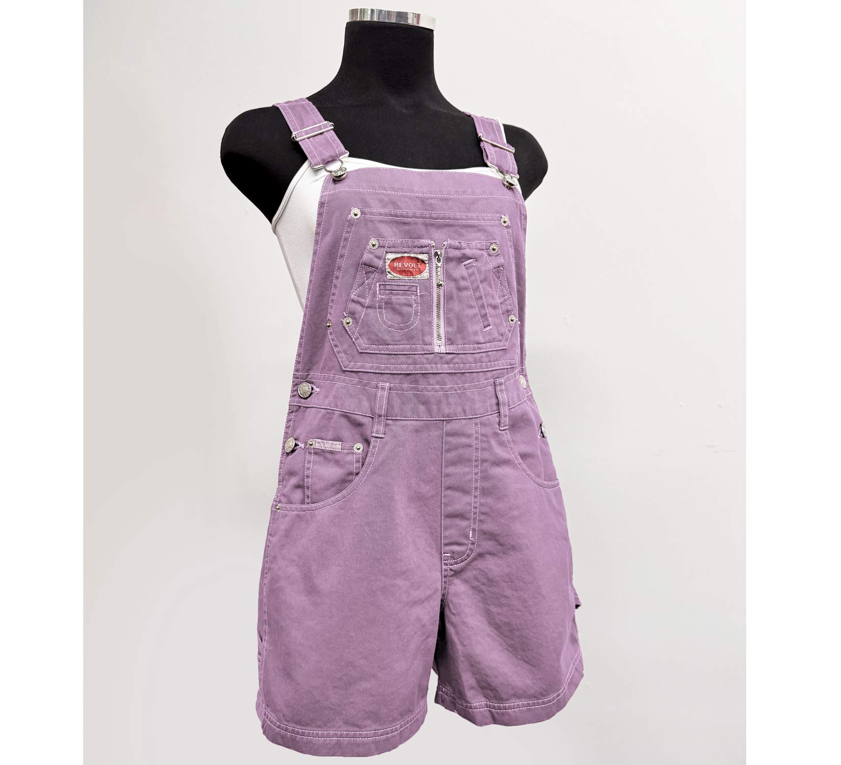 Short overalls with a multi pocket bib and logo patch detail. Traditional straps with clasp closures. Pockets on the sides and back with button closures at the sides. Looks great paired with crop tops.