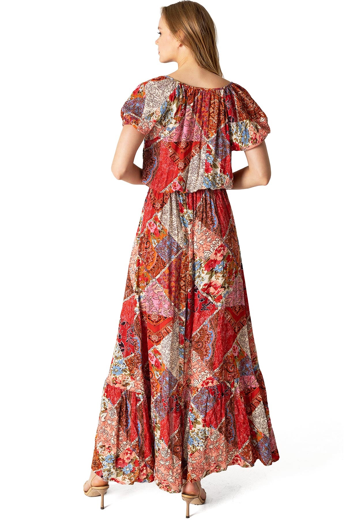 Patchwork style maxi dress with bright bohemian mixed prints. Short, puff sleeves and a v-neckline. Relaxed silhouette with an elastic waist and a self-tie rope belt. A-line style with a center leg slit.