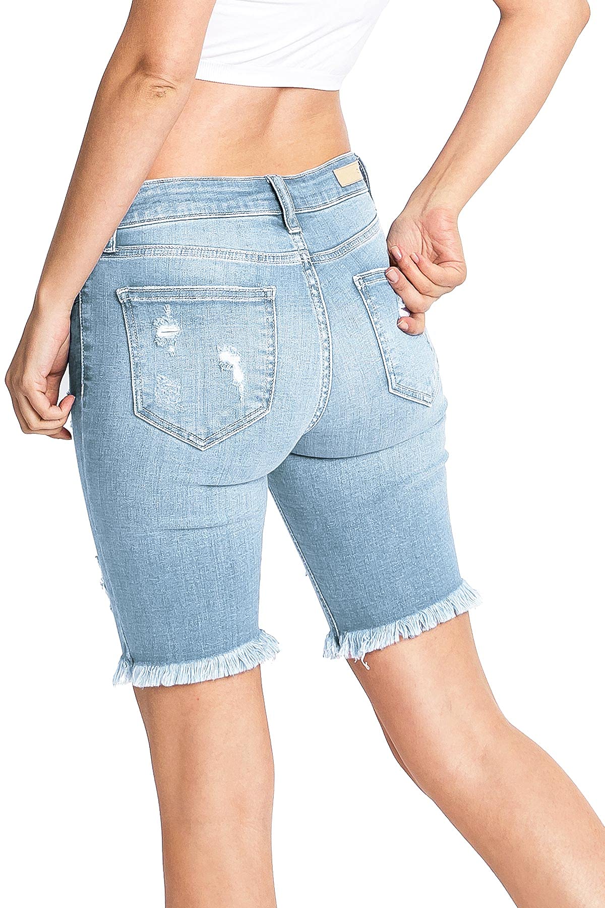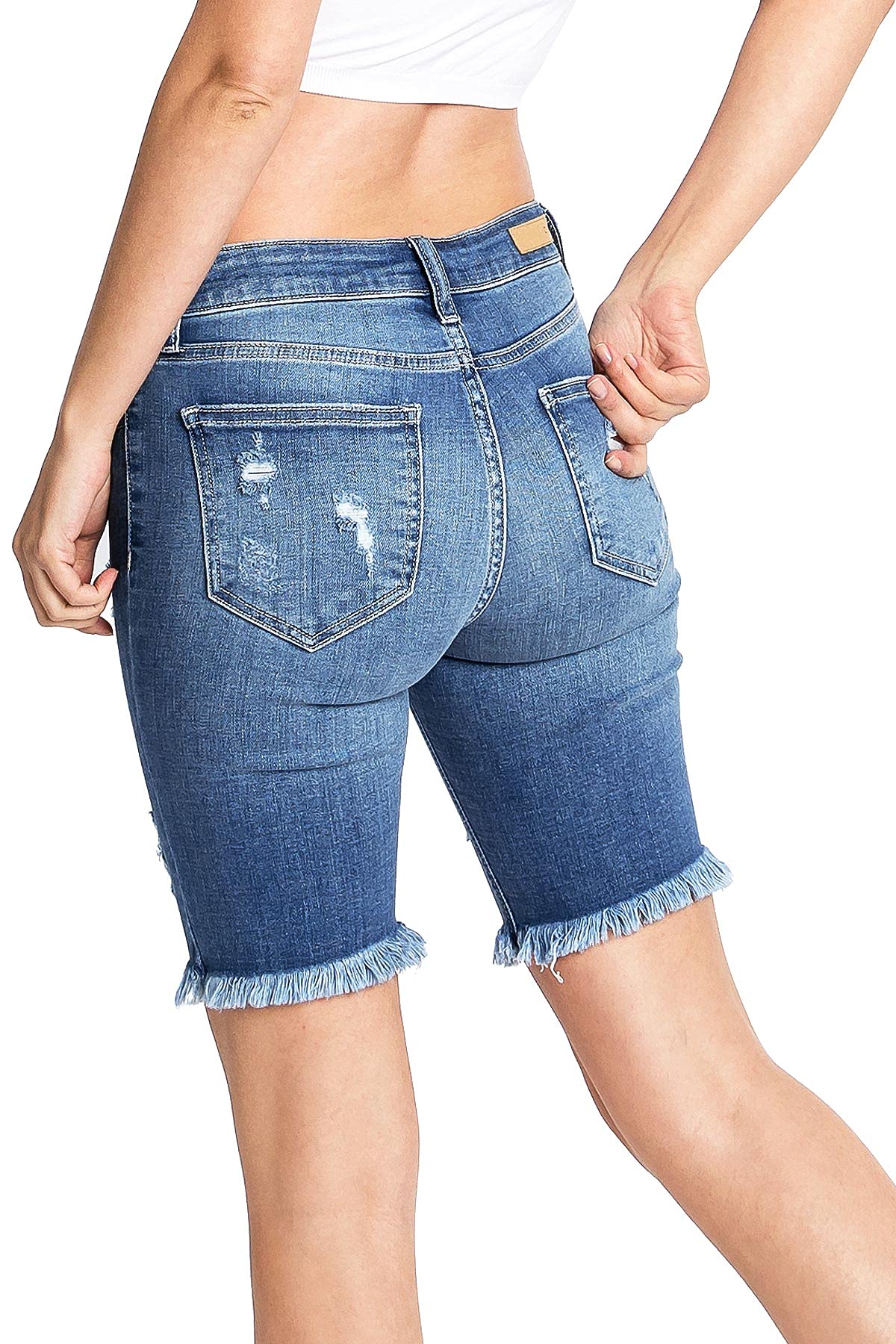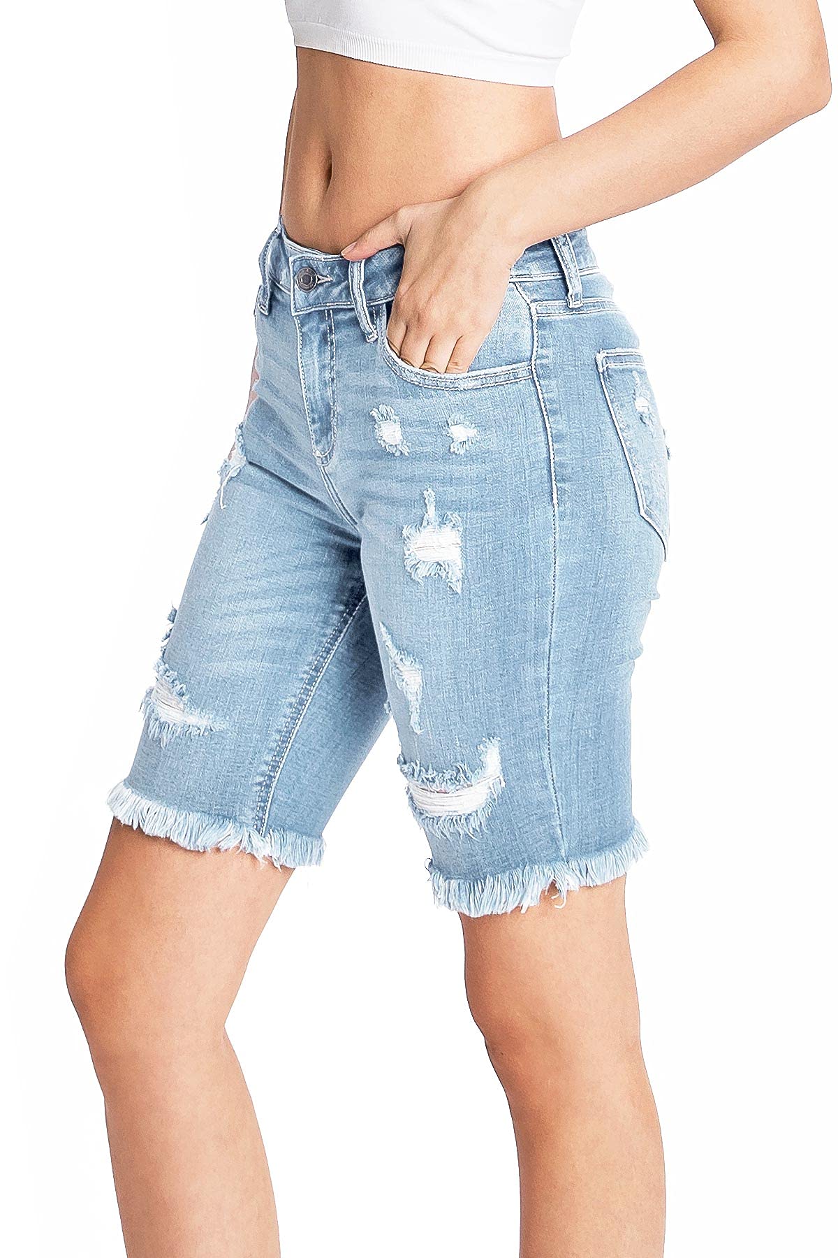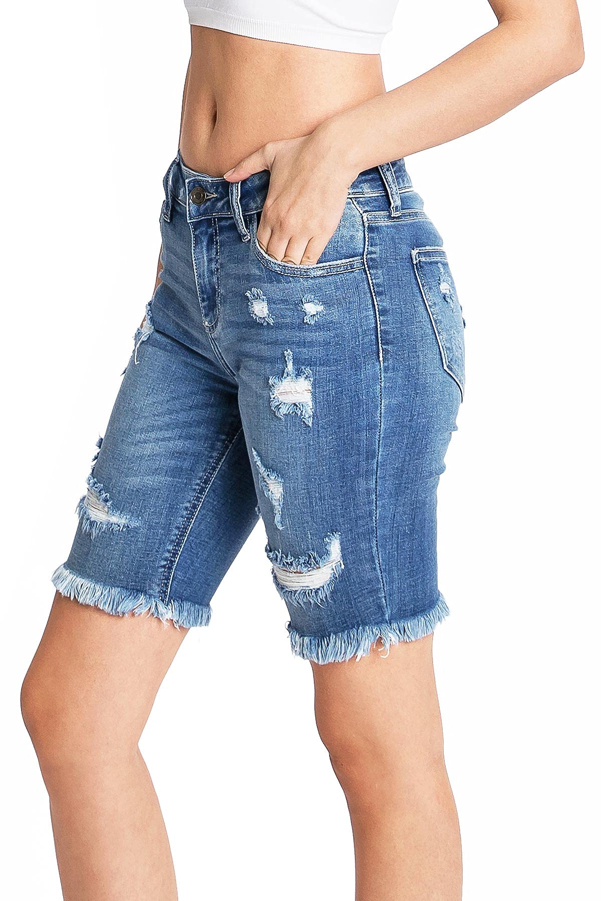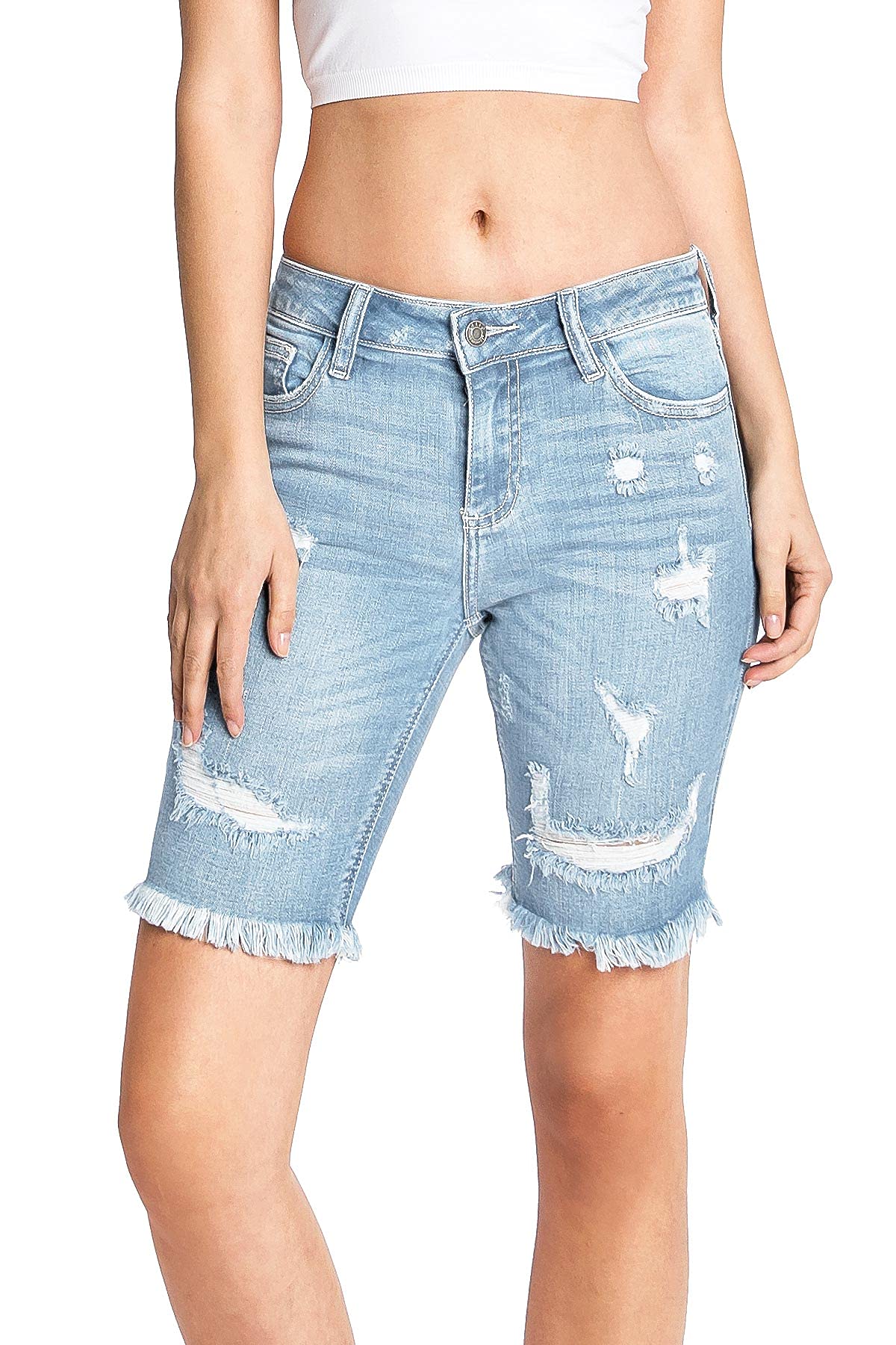 Mid-rise bermuda denim shorts with distressing across the front and a frayed hem. Traditional 5 pockets with button and zip fly closure. Light stretch in denim.