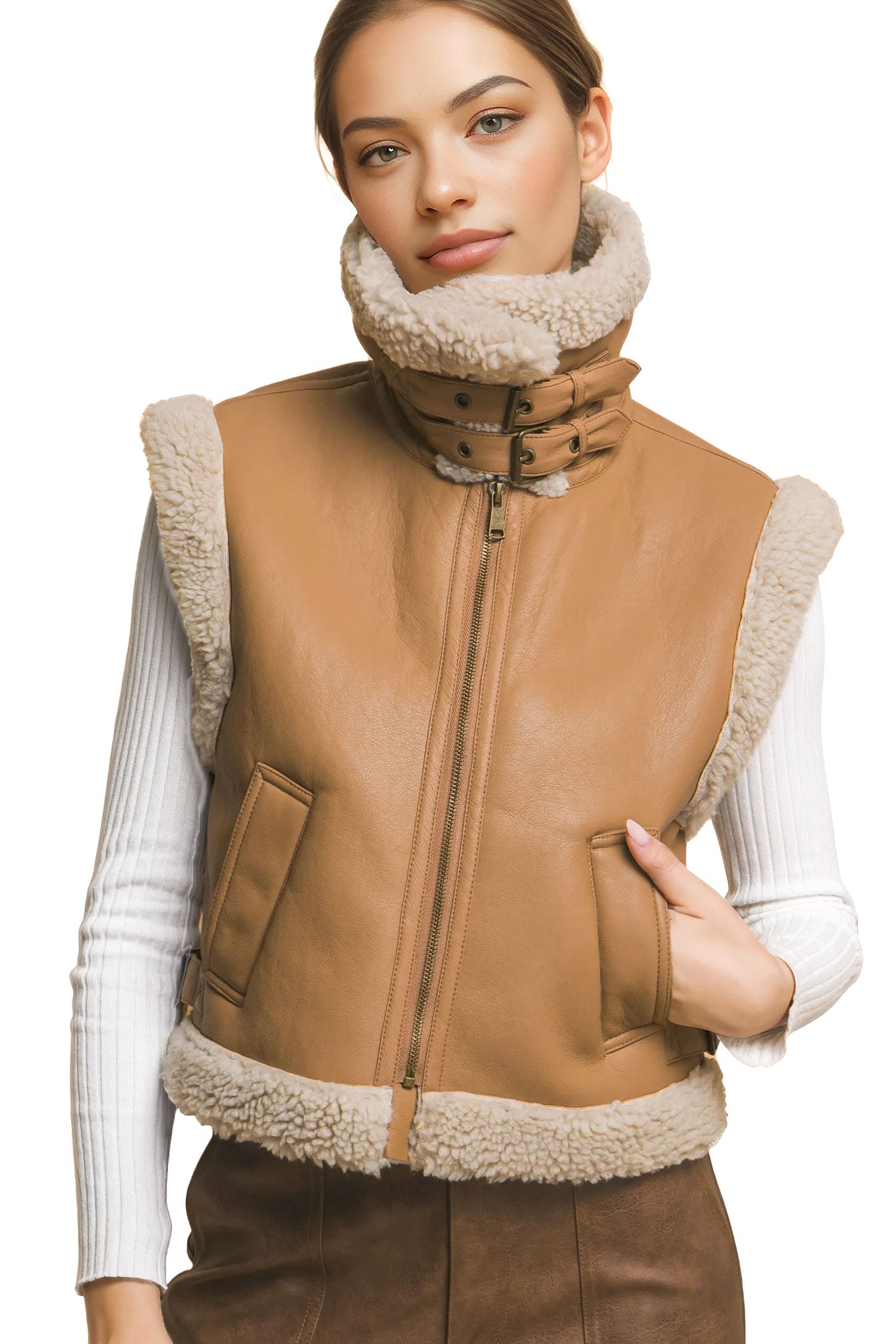 Edgy, faux leather vest with a soft, faux shearling lining. Stand collar neckline with buckles and a traditional zipper closure down the front with pockets on the sides.