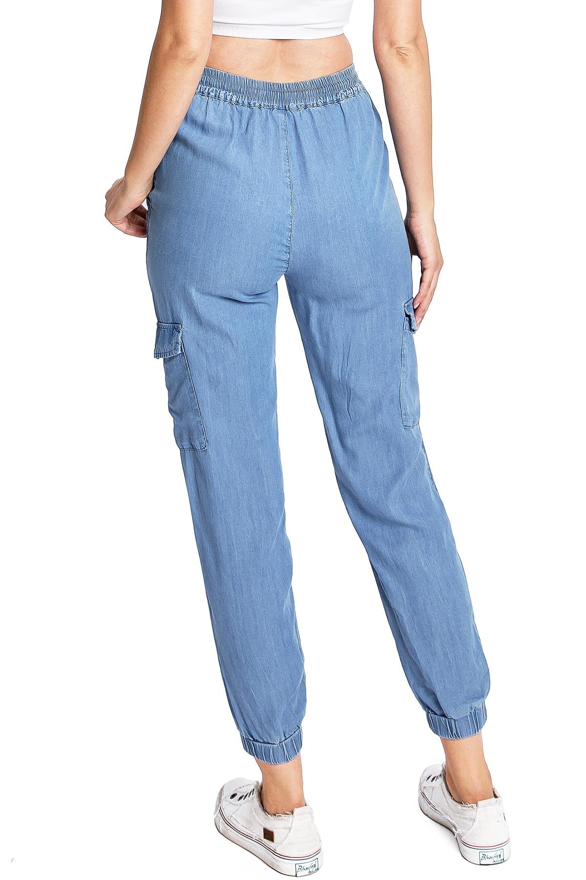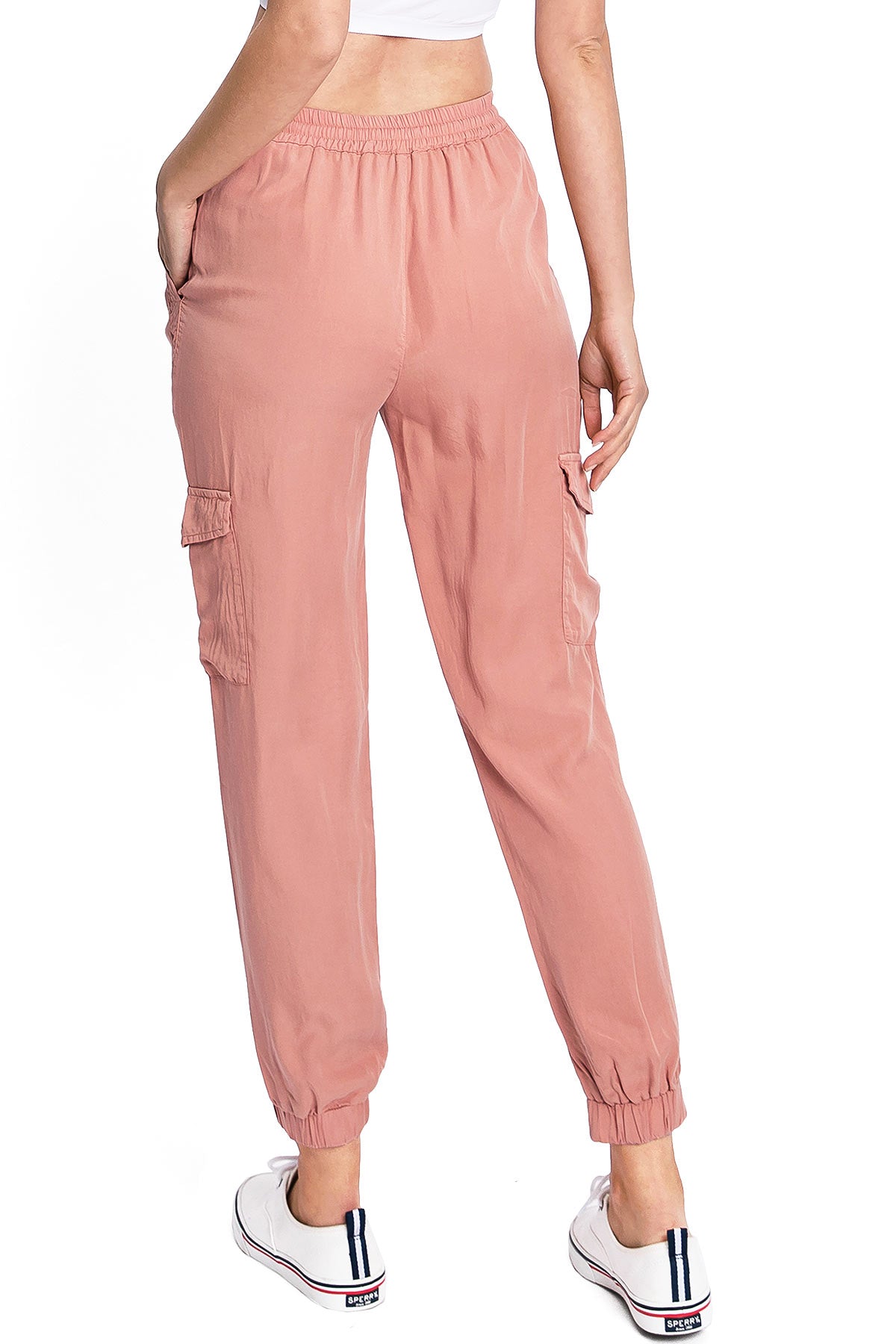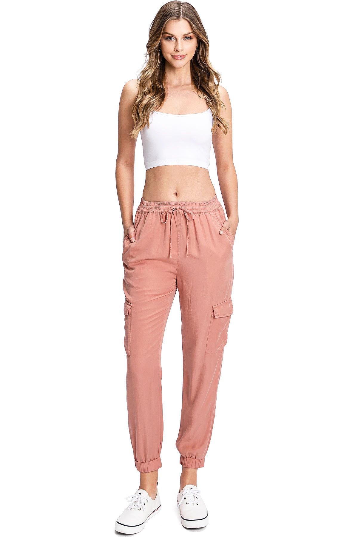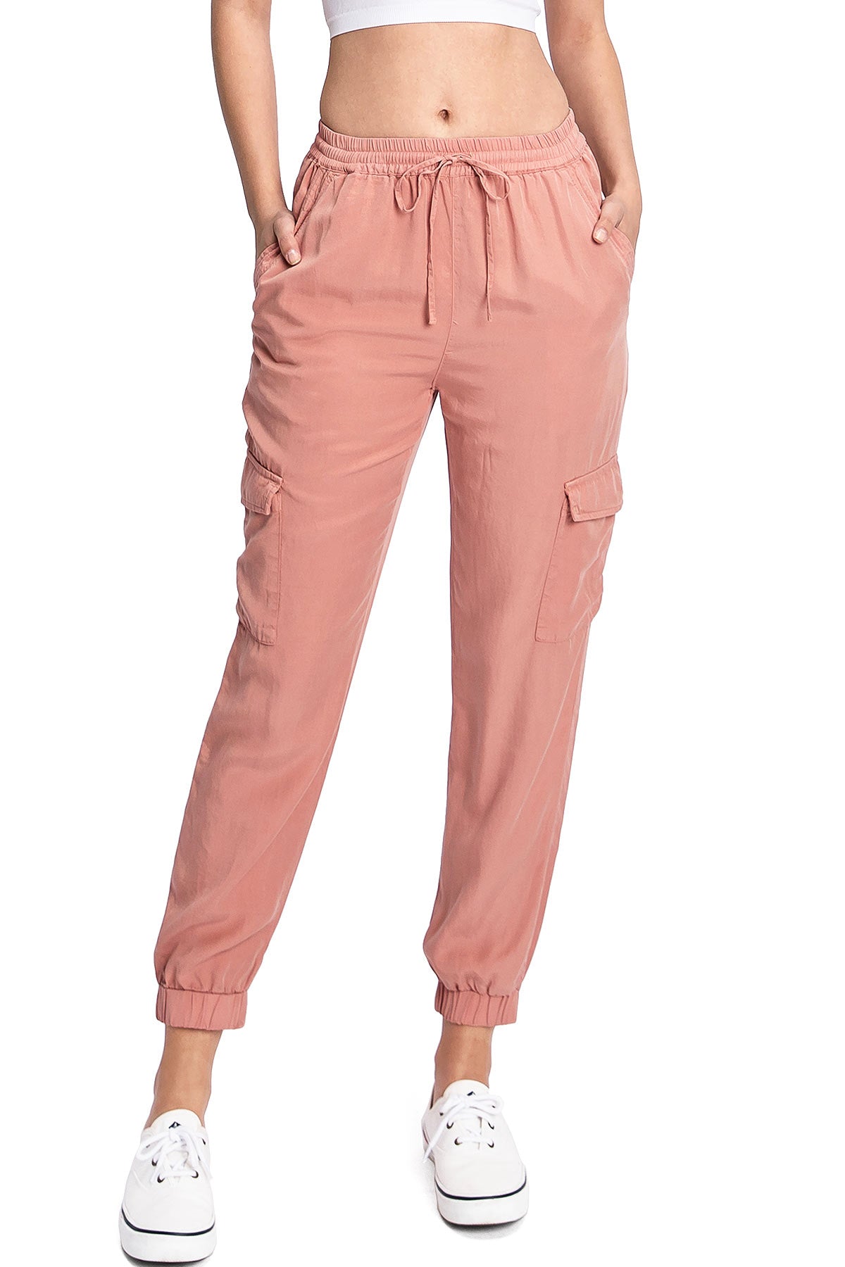 Light weight jogger pants with a high rise fit, a stretchy smocked waist and a drawstring tie. Pockets on the front and back.