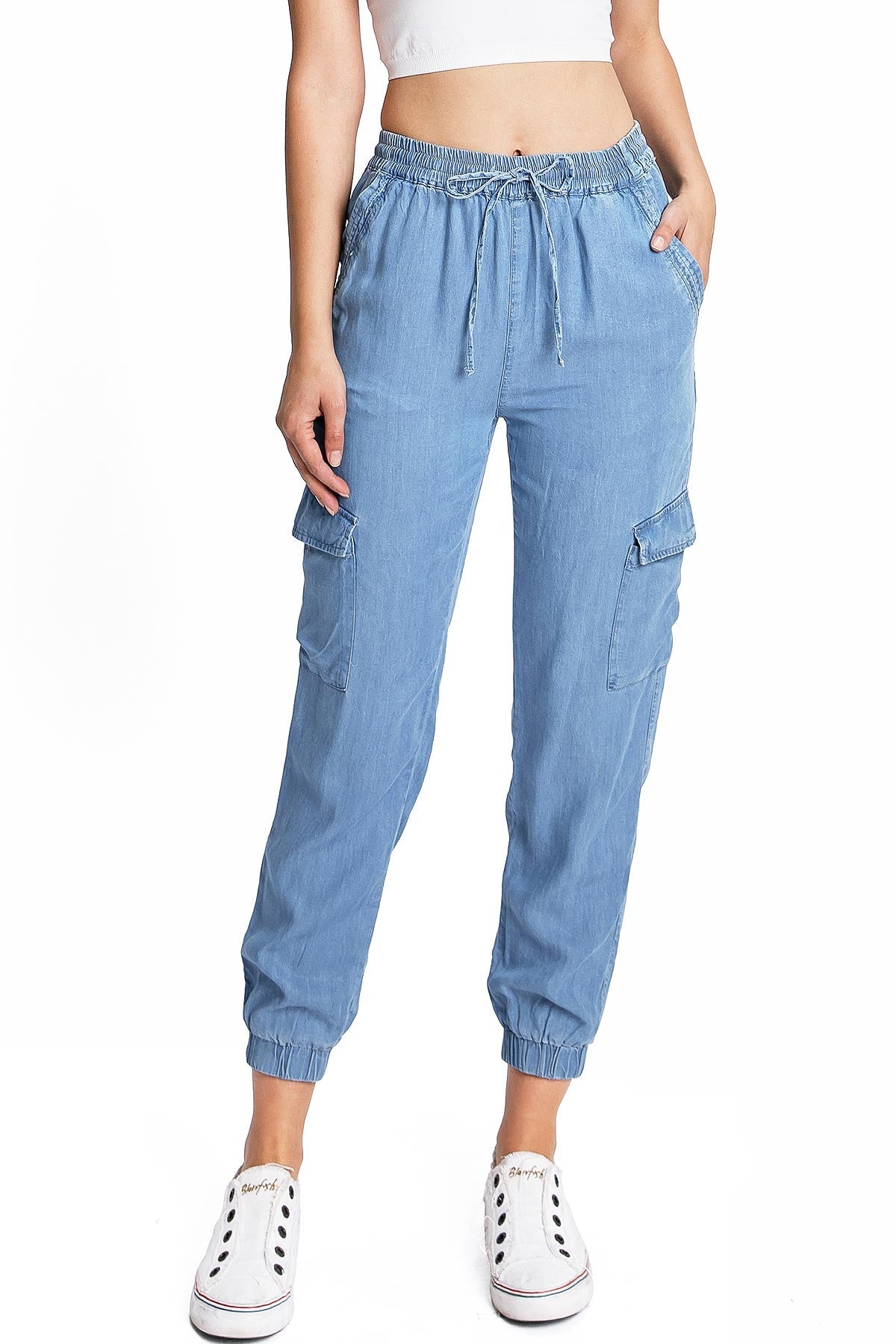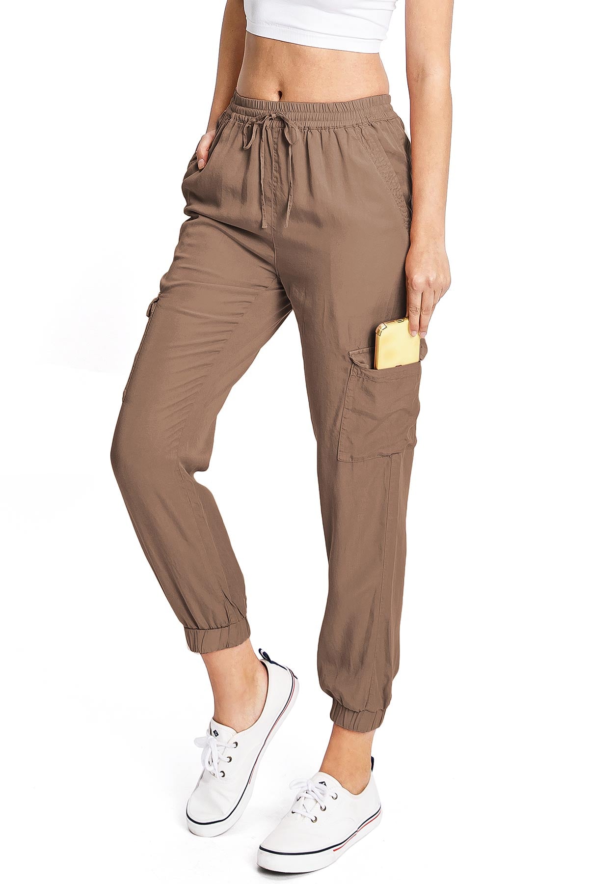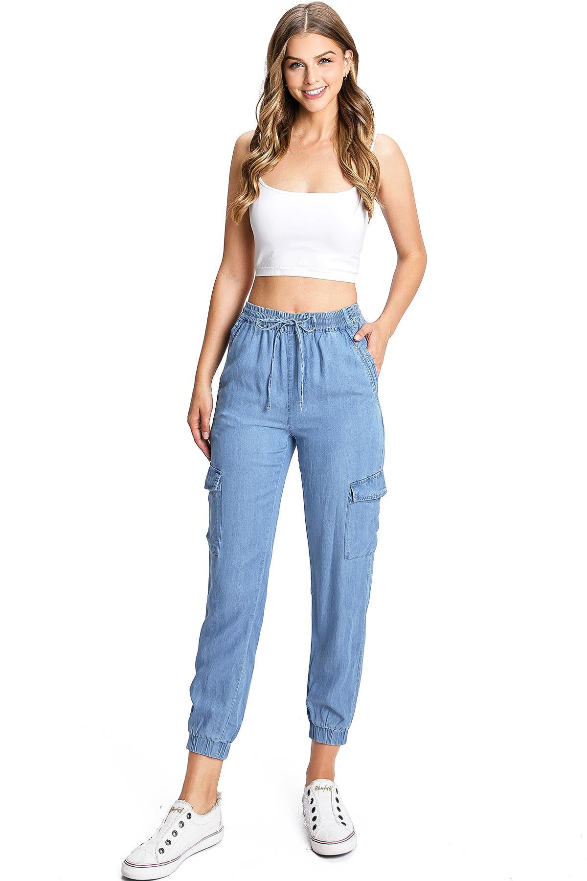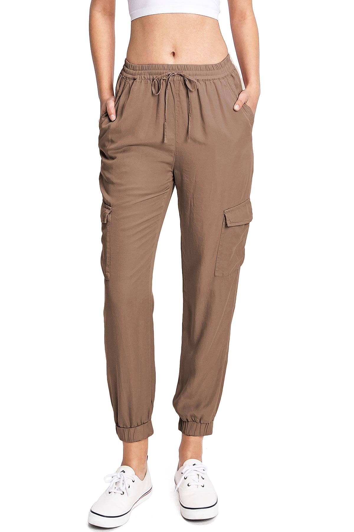Light weight jogger pants with a high rise fit, a stretchy smocked waist and a drawstring tie. Pockets on the front and back.