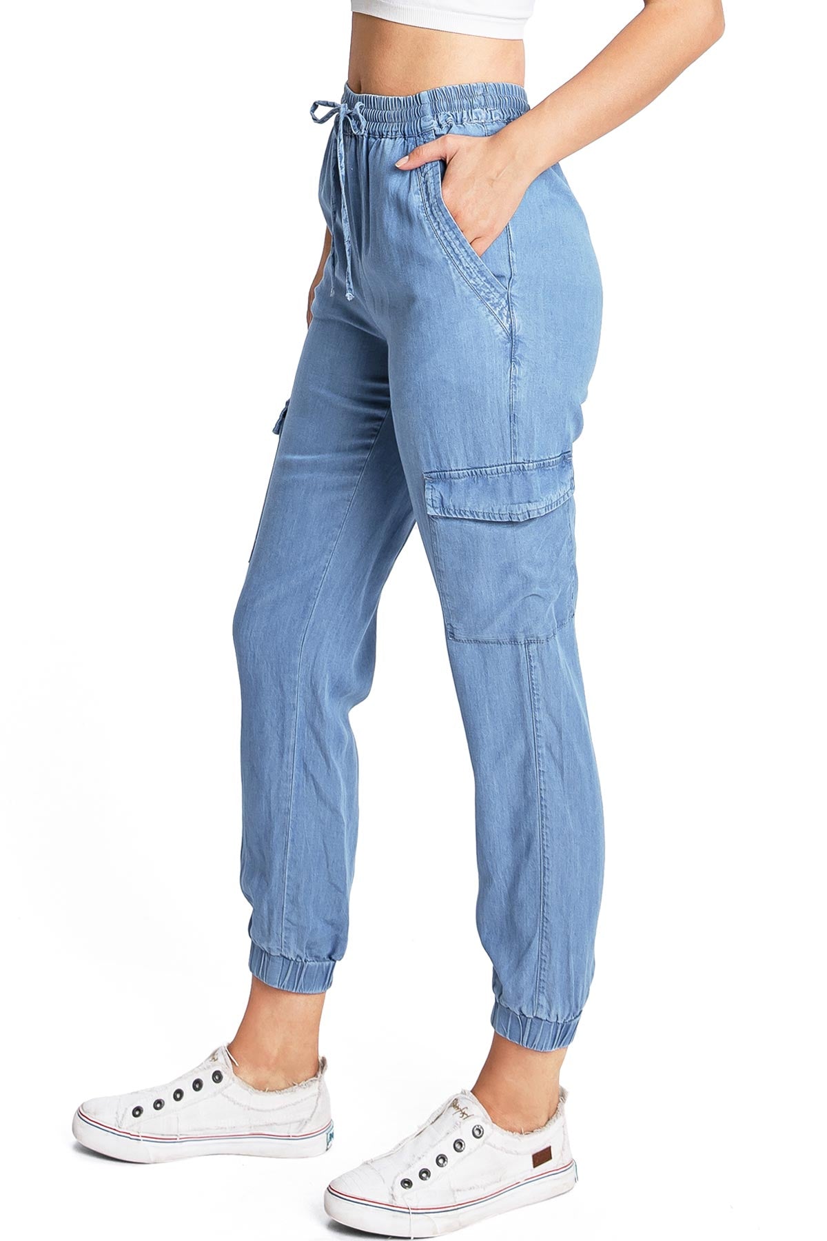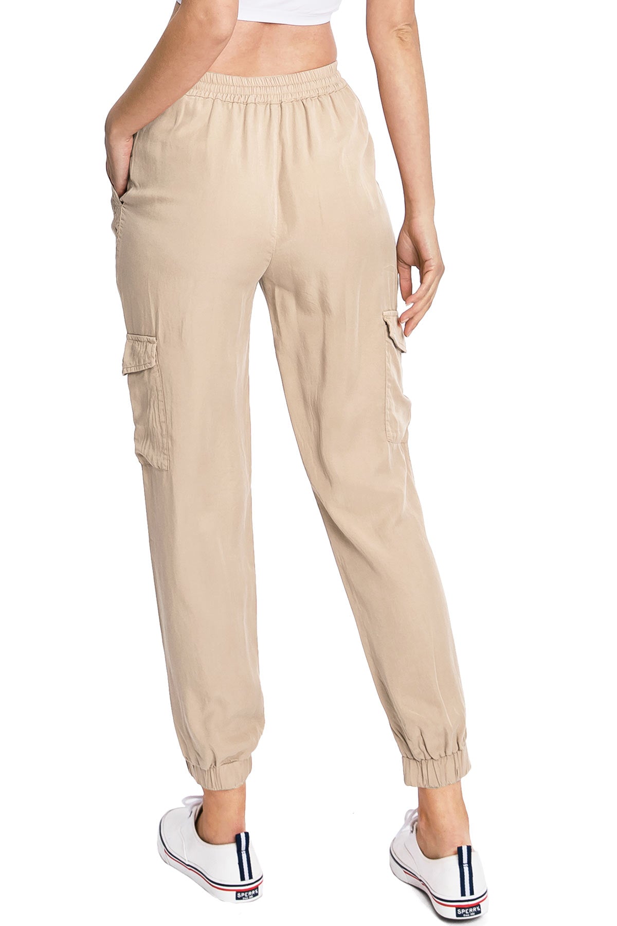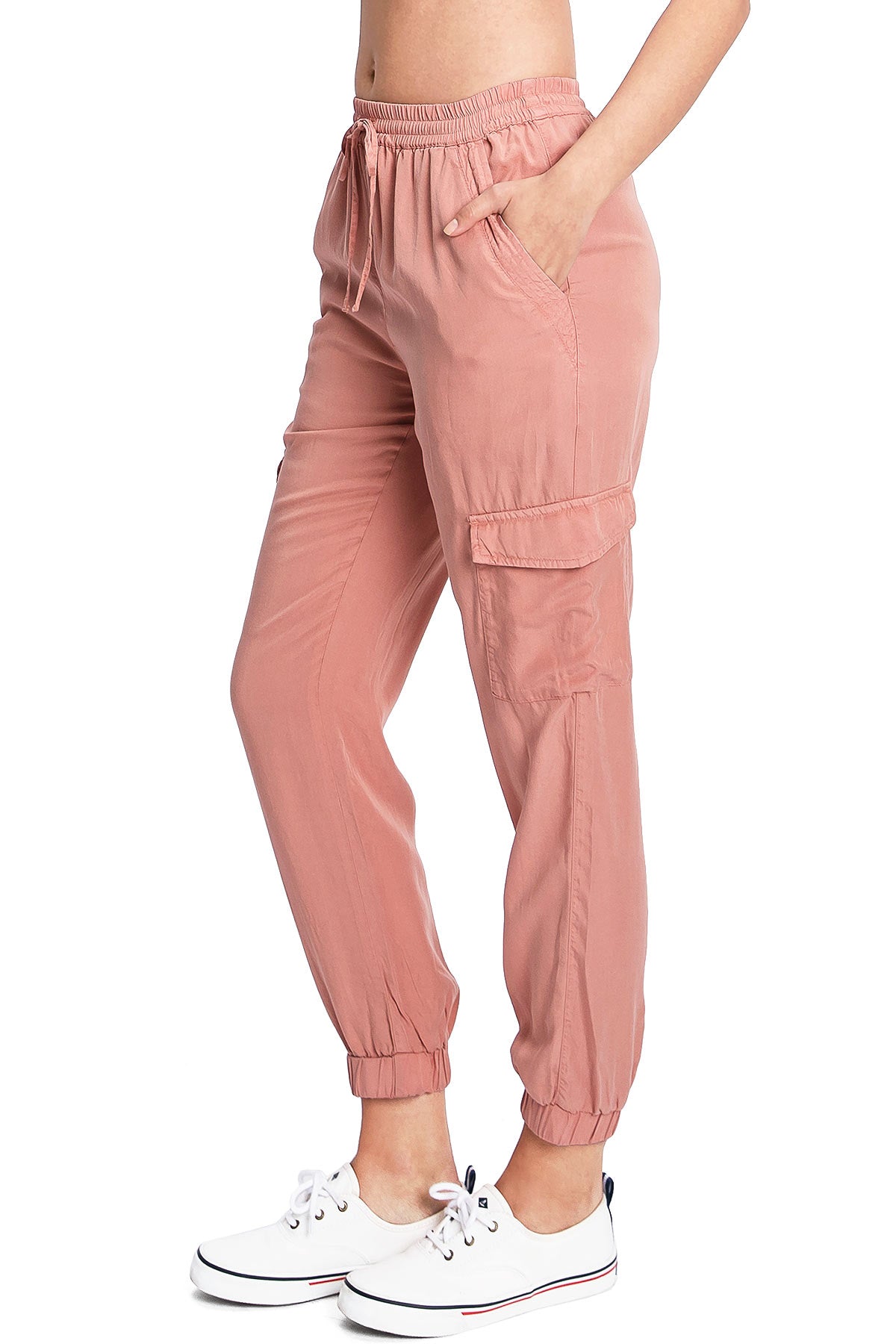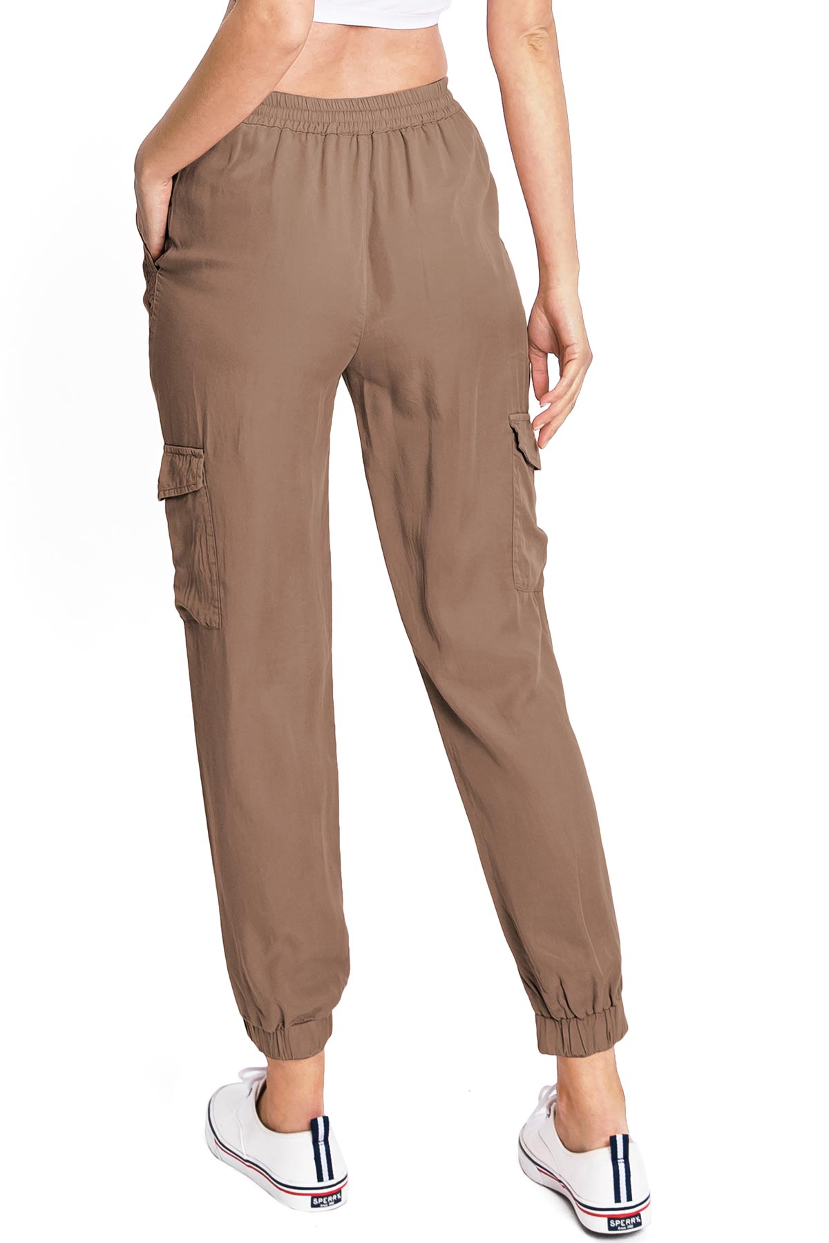 Light weight jogger pants with a high rise fit, a stretchy smocked waist and a drawstring tie. Pockets on the front and back.