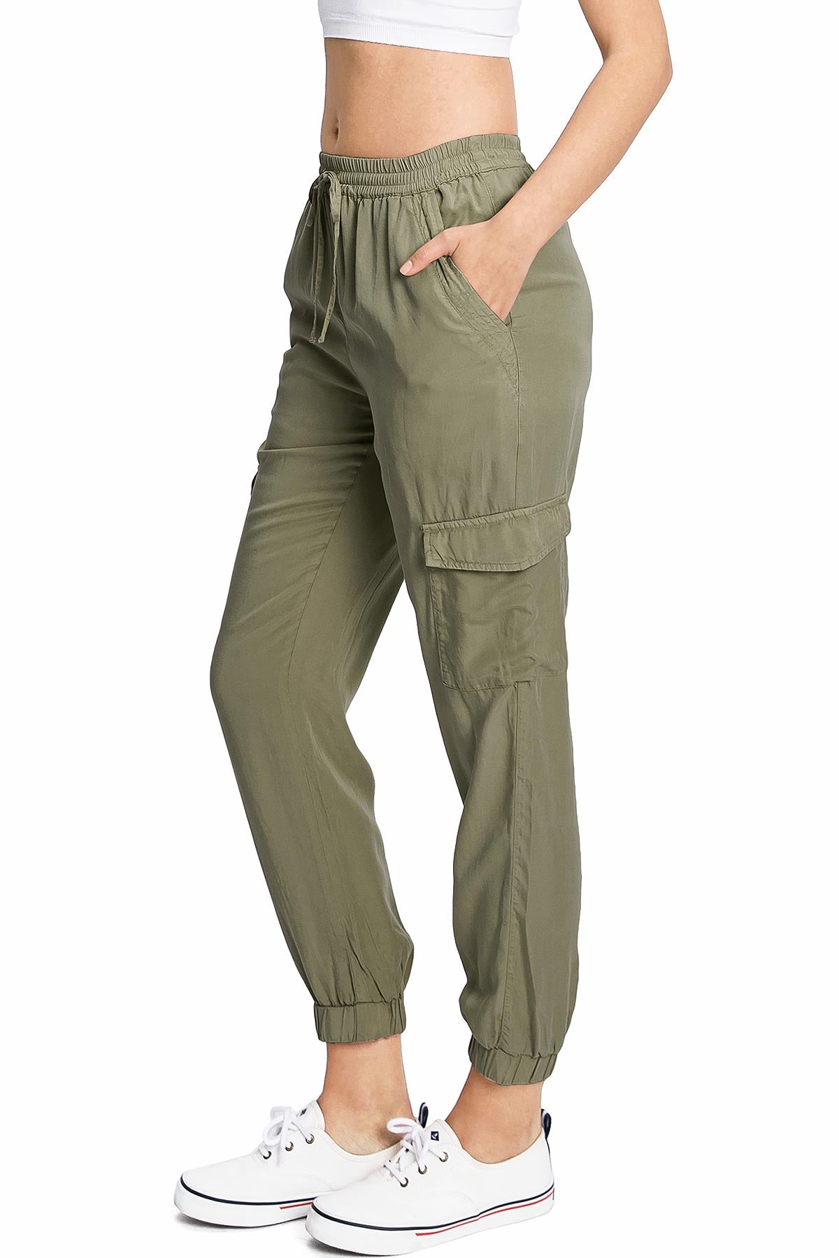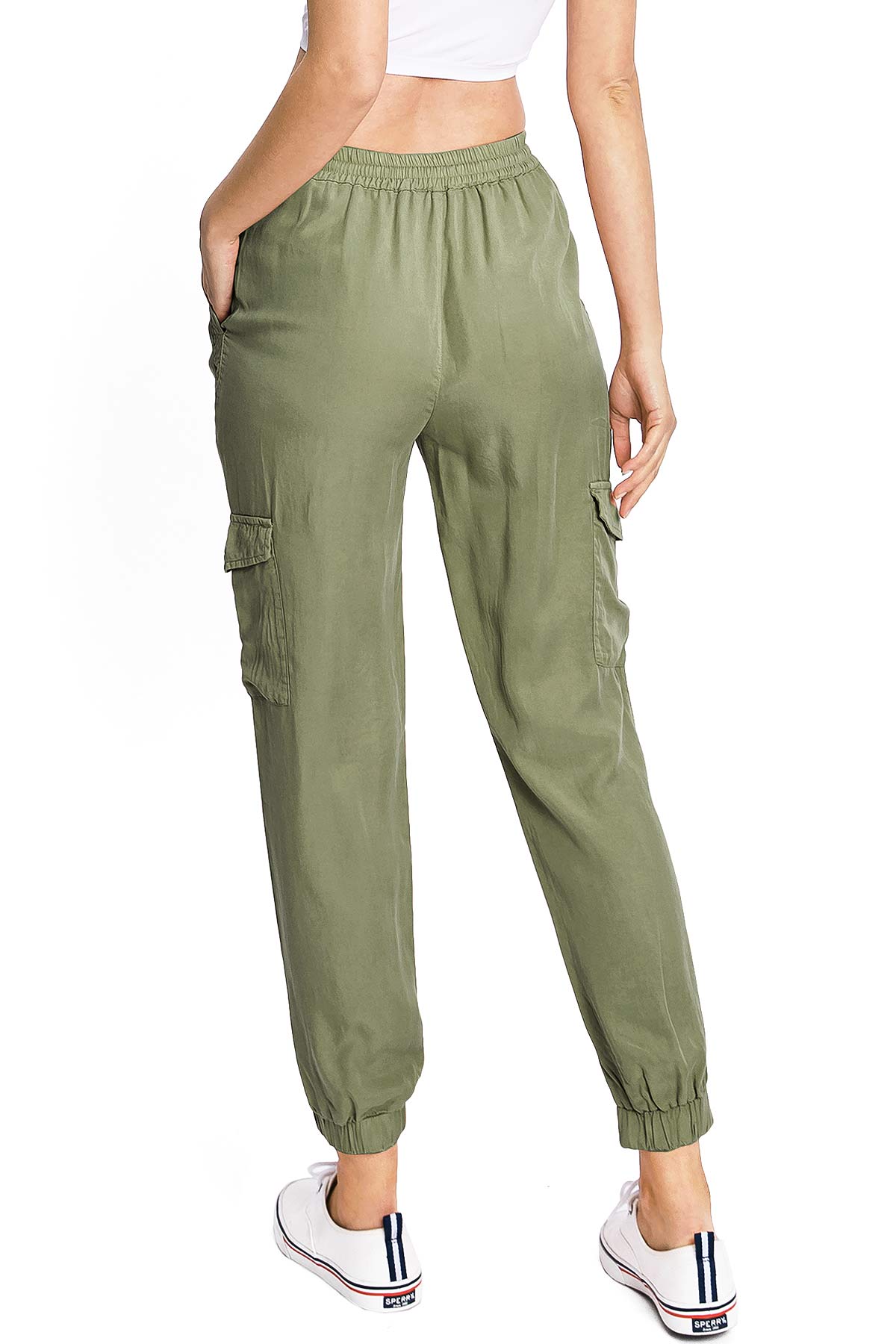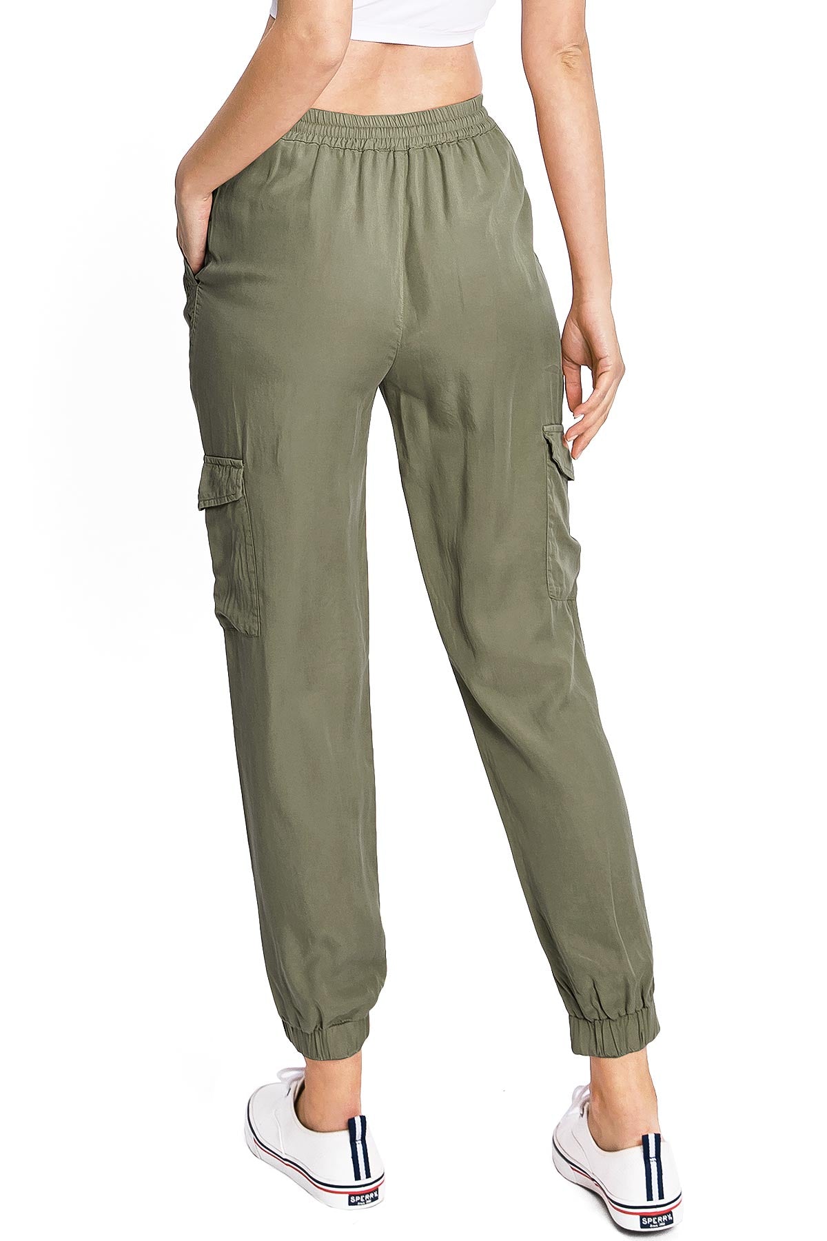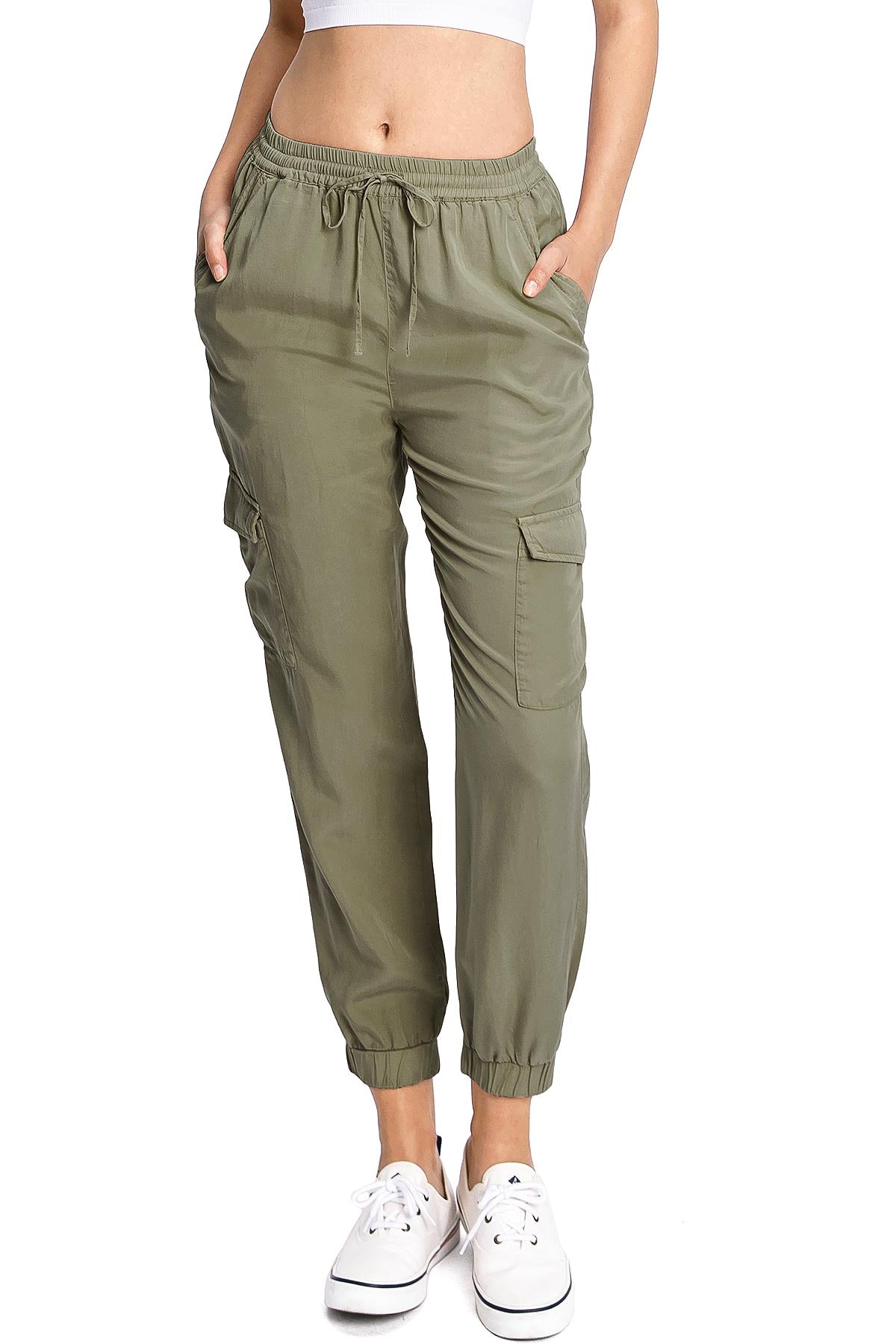 Light weight jogger pants with a high rise fit, a stretchy smocked waist and a drawstring tie. Pockets on the front and back.