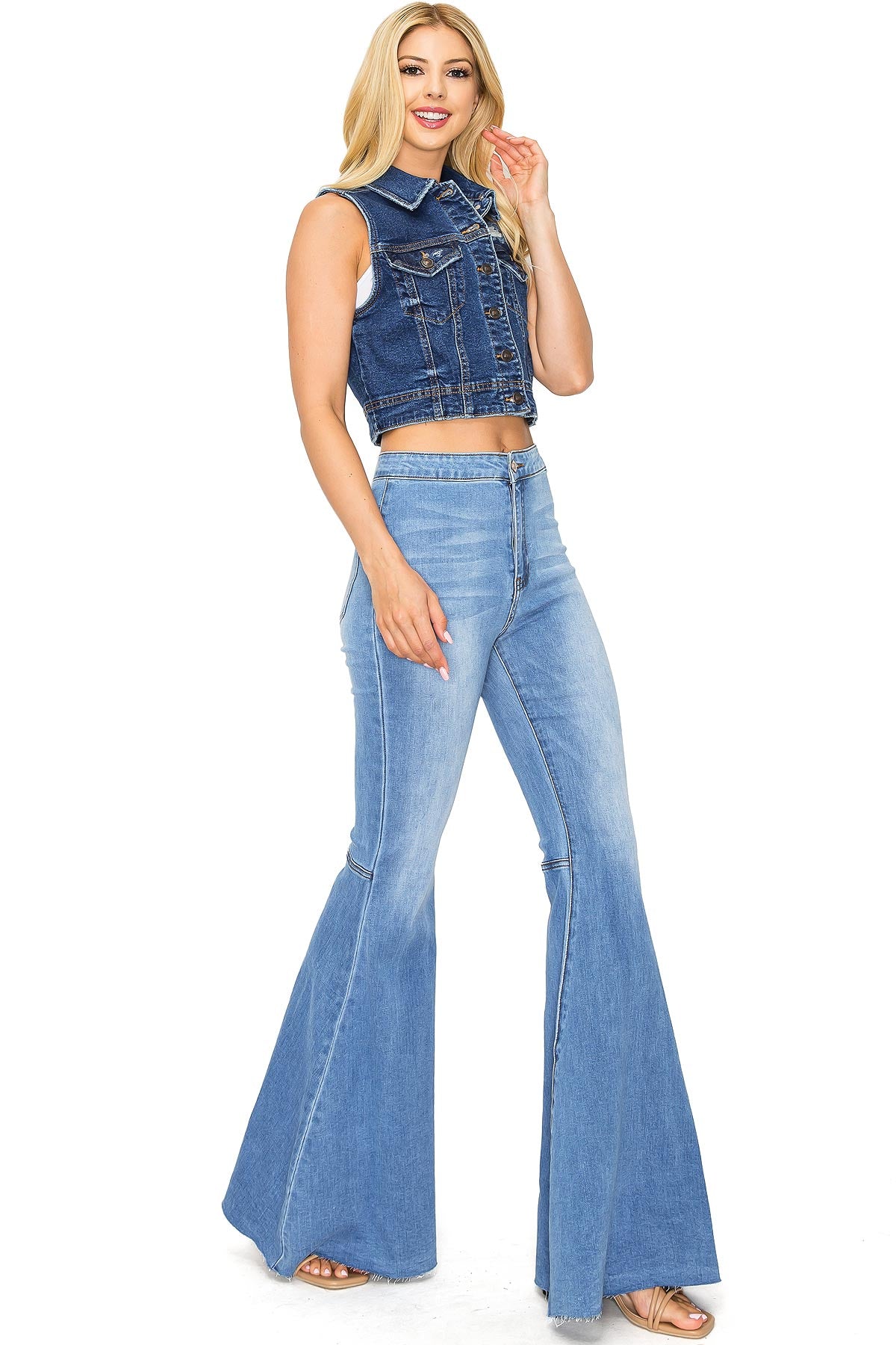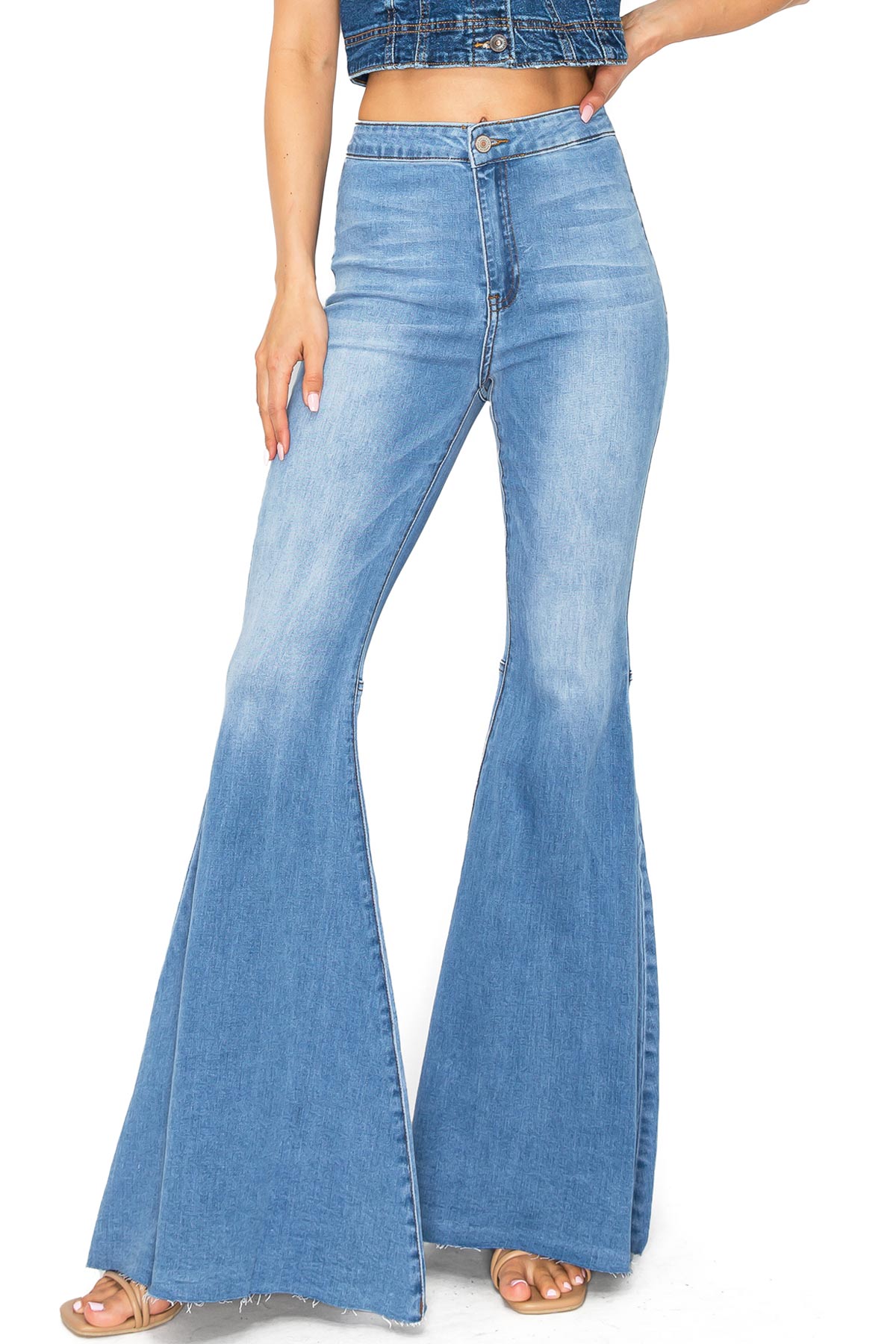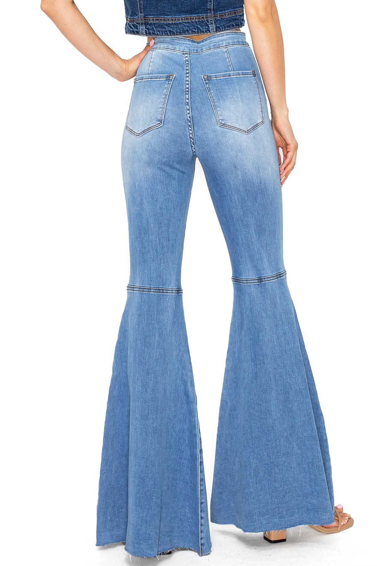 Essential denim flares with a super stretchy and skin tight fit. Flat stretchy waistband with zip fly and button closure with pockets on the back. Minimal style with a frayed hem.