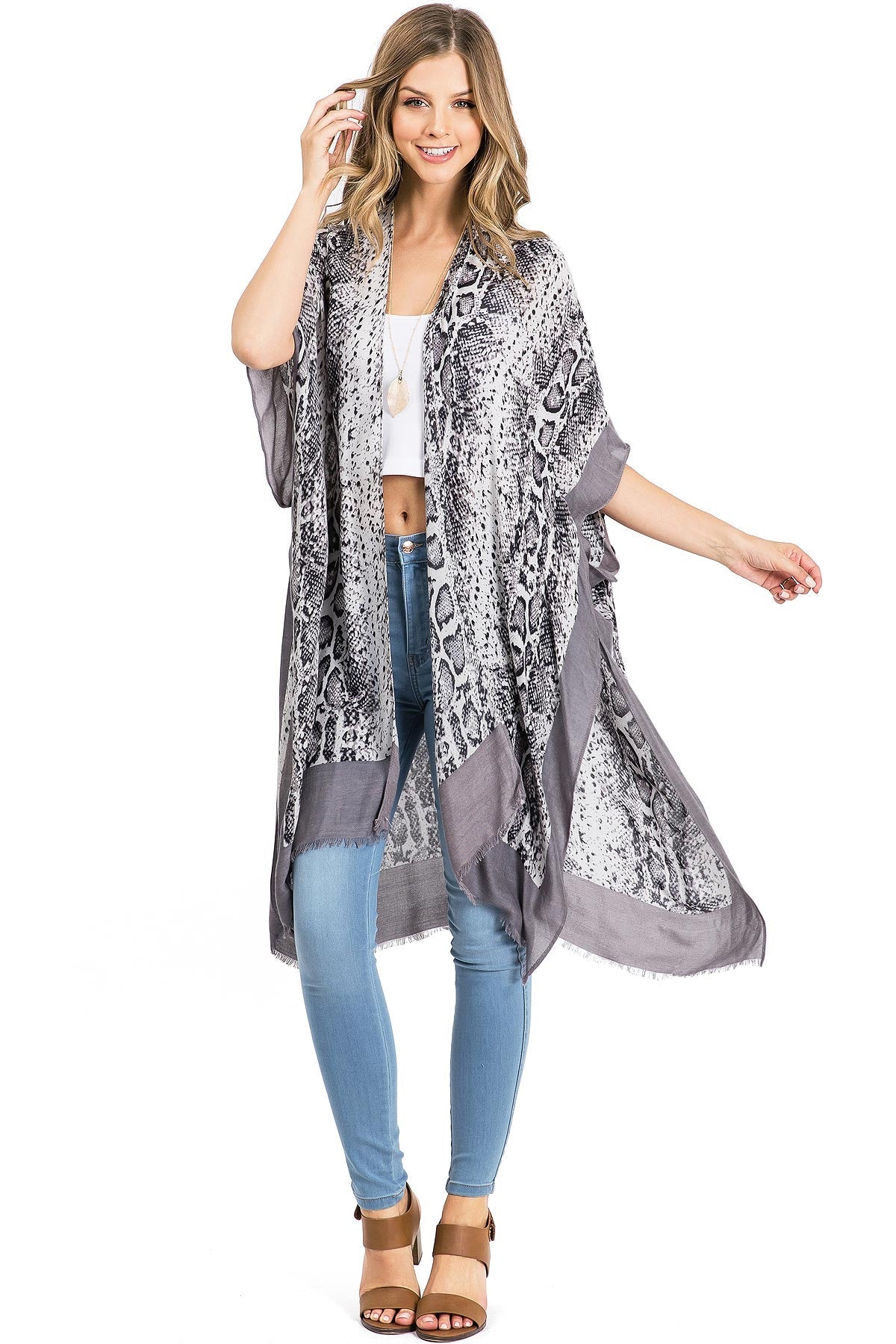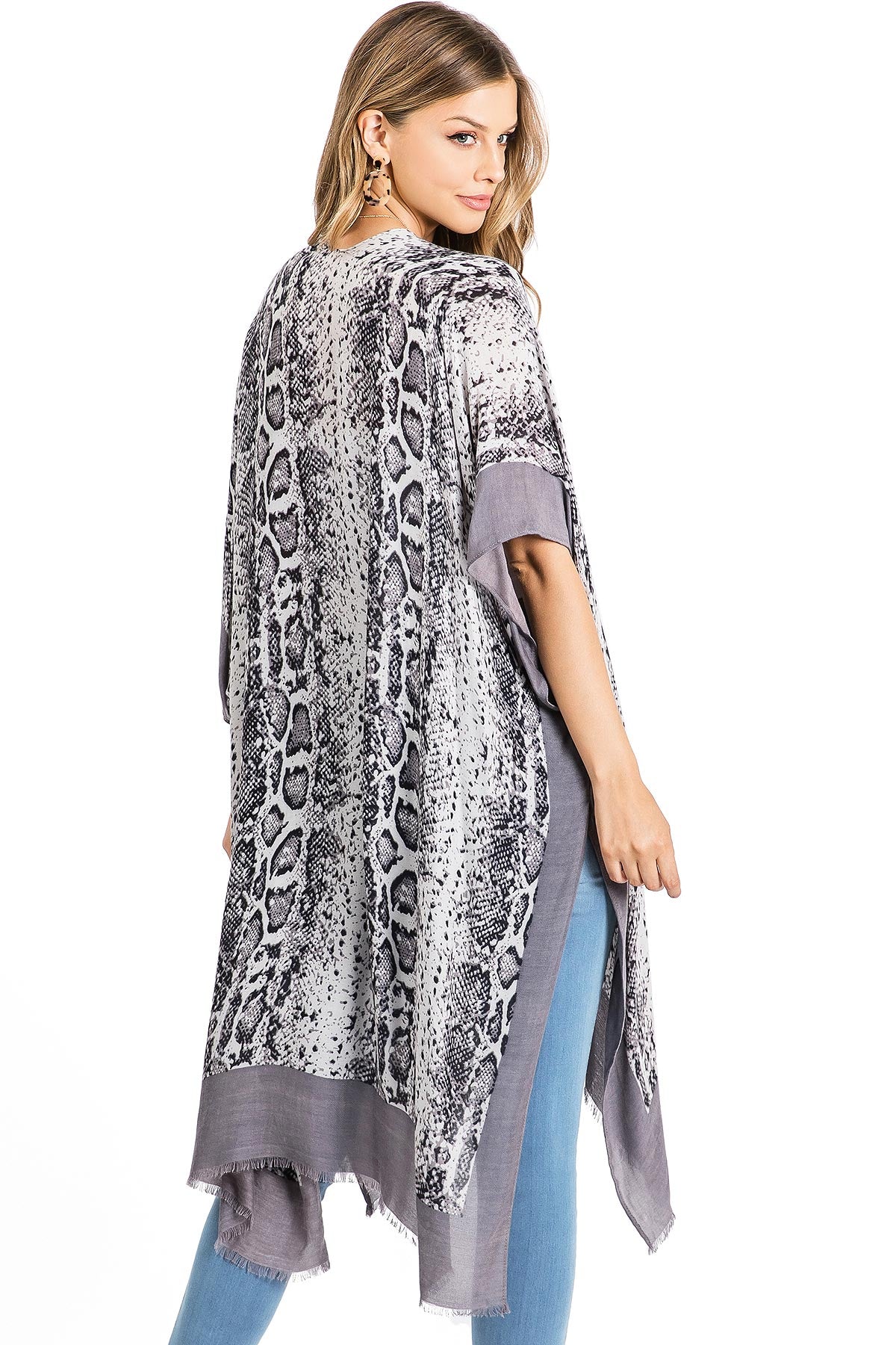 Kimono cardigan with a snake print, 3/4 sleeves with a soft frayed edge. Effortless silhouette, perfect for layering over casual outfits or over a swimsuits.
