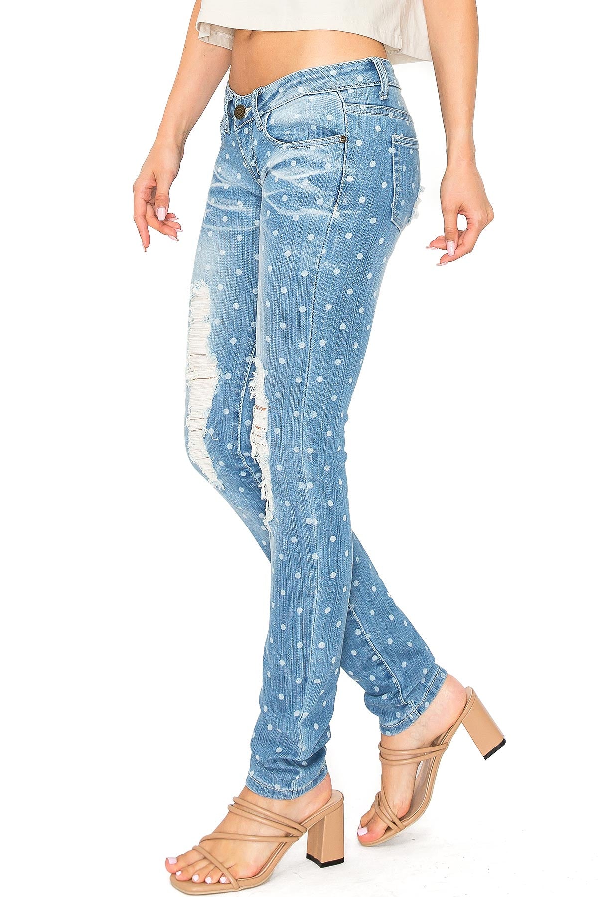 Low-rise skinny jeans with an all-over polka dot print and light distressing details down the front. Traditional 5-pocket construct with a zip fly and button closure. Slim-fit silhouette with decent stretch. Size up recommended.