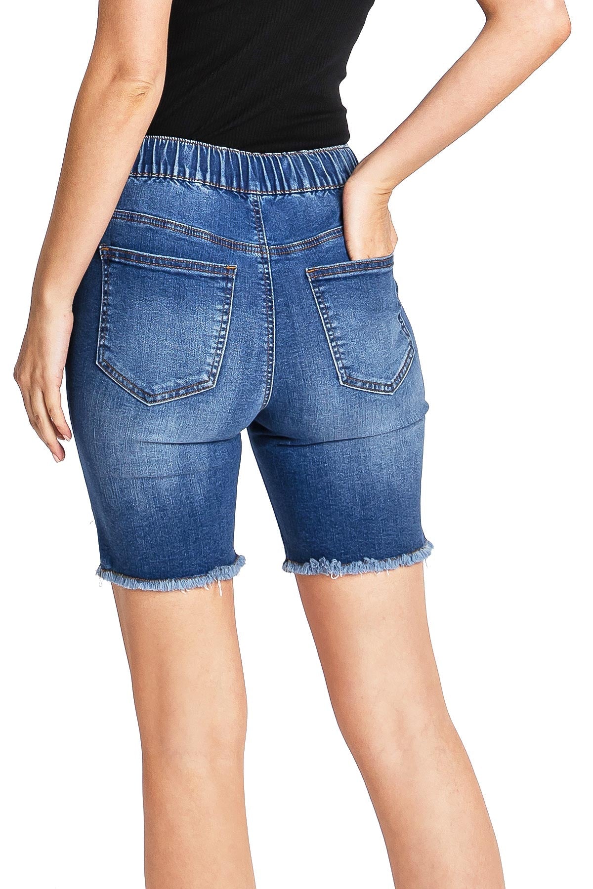 High-rise bermuda shorts with a draw-shoestring waist and a frayed hem. Classic denim feel with a comfortable stretchy fit. Front and back pockets.
