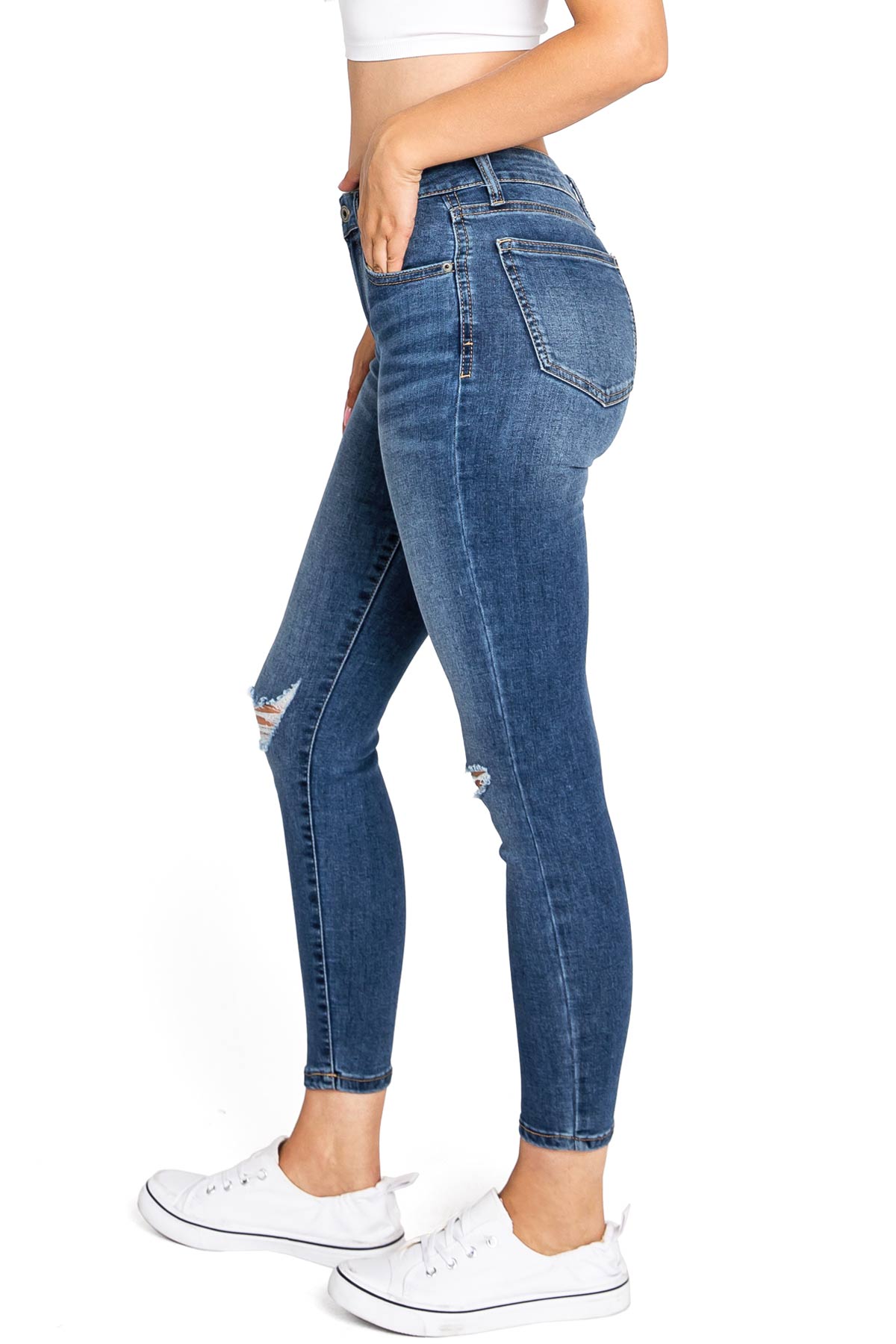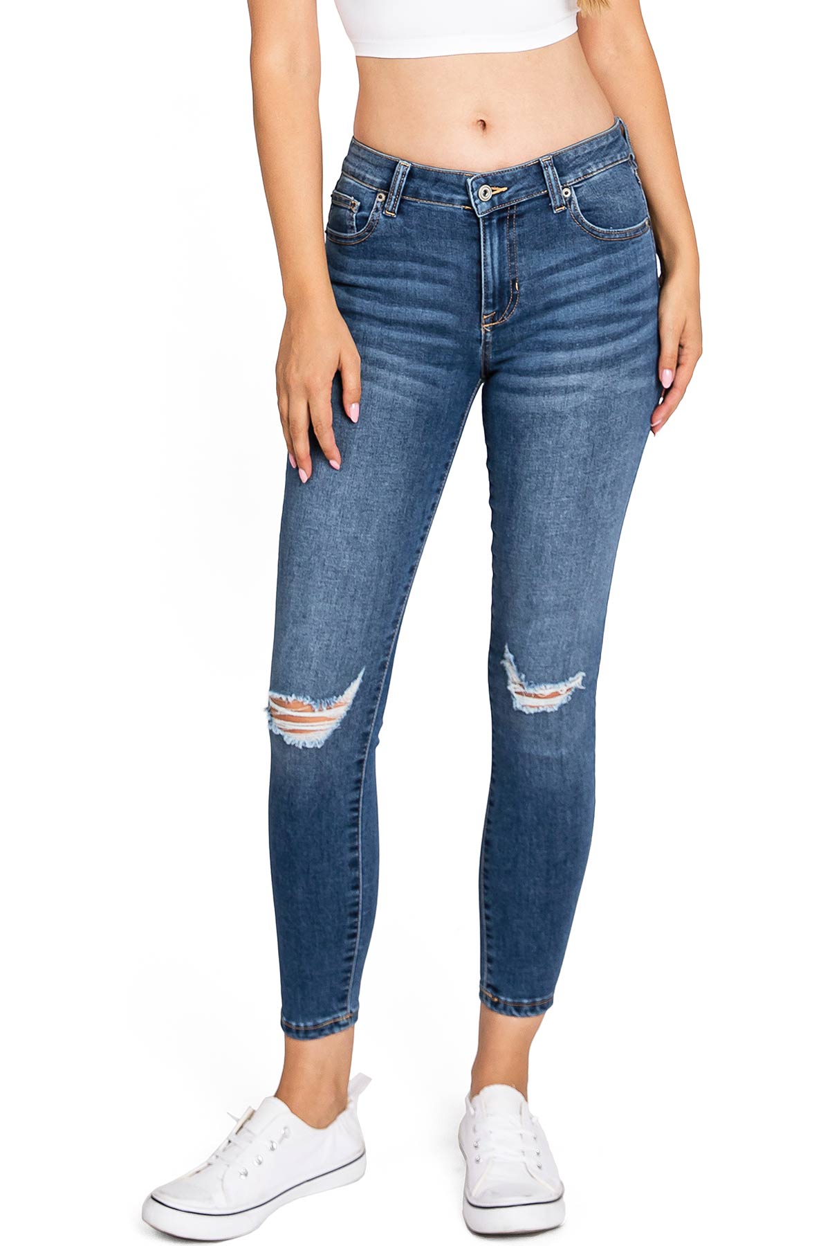 Mid-rise skinny jeans with ripped knees and an ankle length. Stretchy denim with traditional 5-pocket construction and zip fly and button closure. Eco-friendly denim made from sustainable sourced materials and developed responsibly.