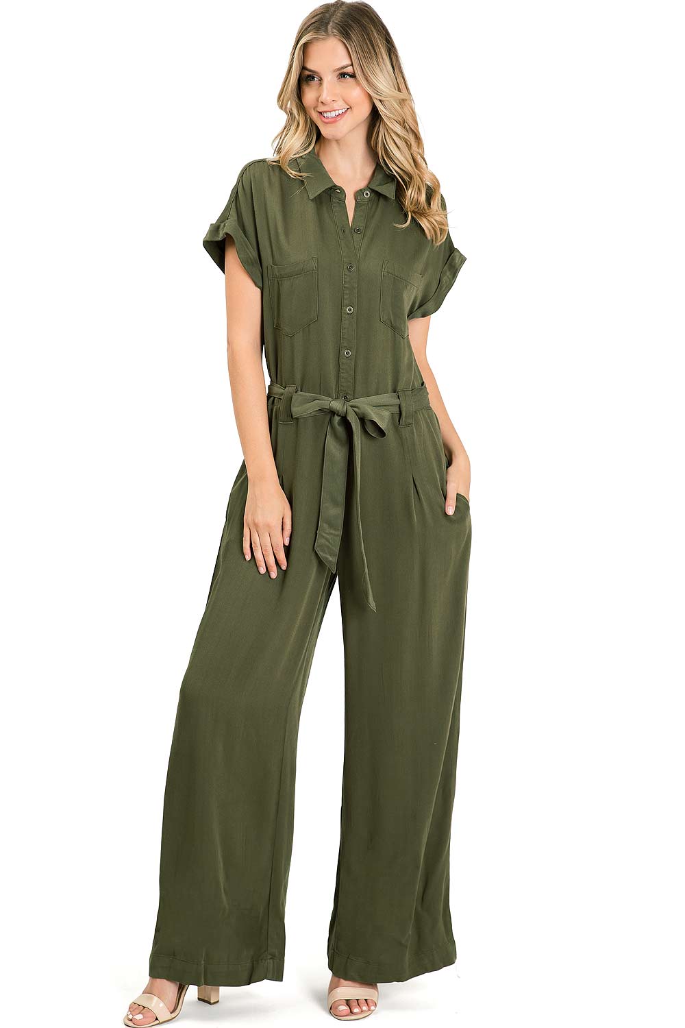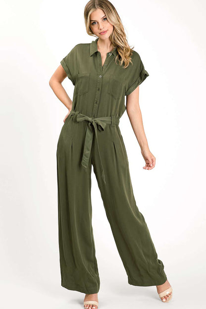 Coverall jumpsuit with short, rolled sleeves and a full length, wide-leg bottom. Button down top with pockets on the sides. Self-tie belt.