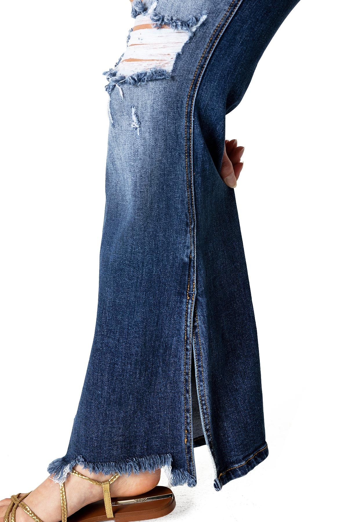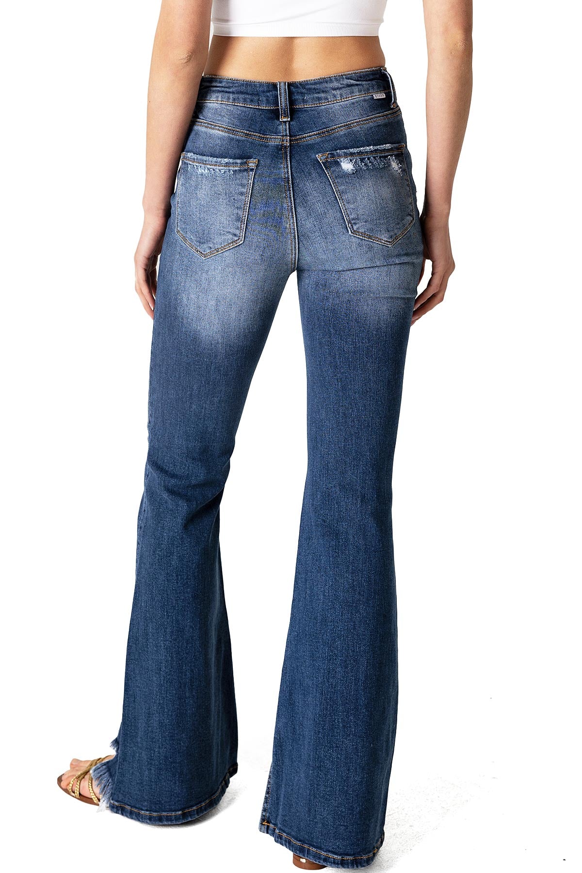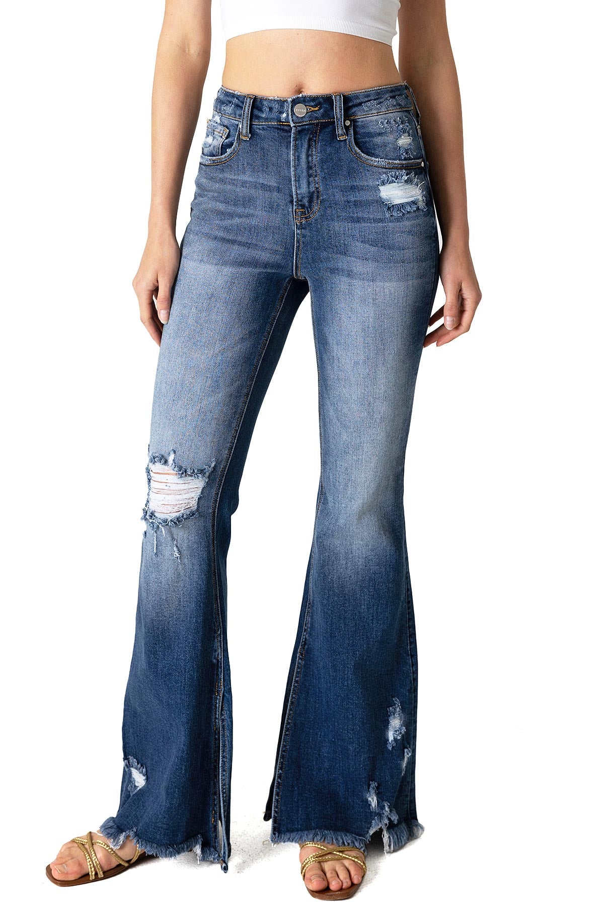 High waist, flare jeans with traditional 5-pocket construction zip fly and button closure. Slim-fit silhouette with an ankle slit and a frayed hem. Stretchy denim with distressed details.
