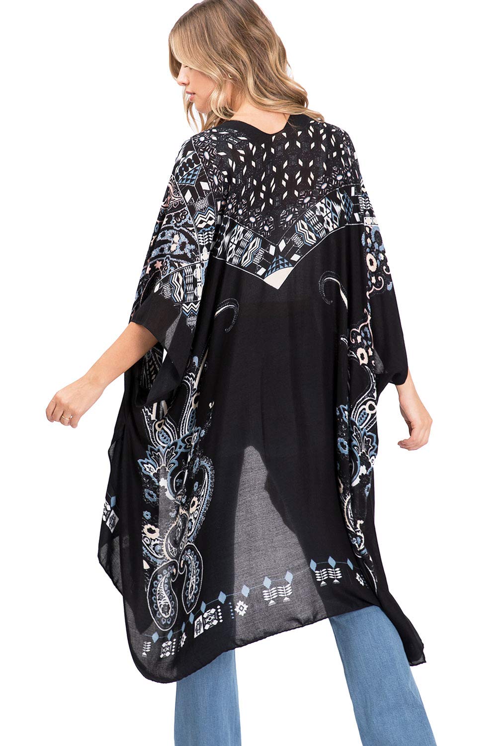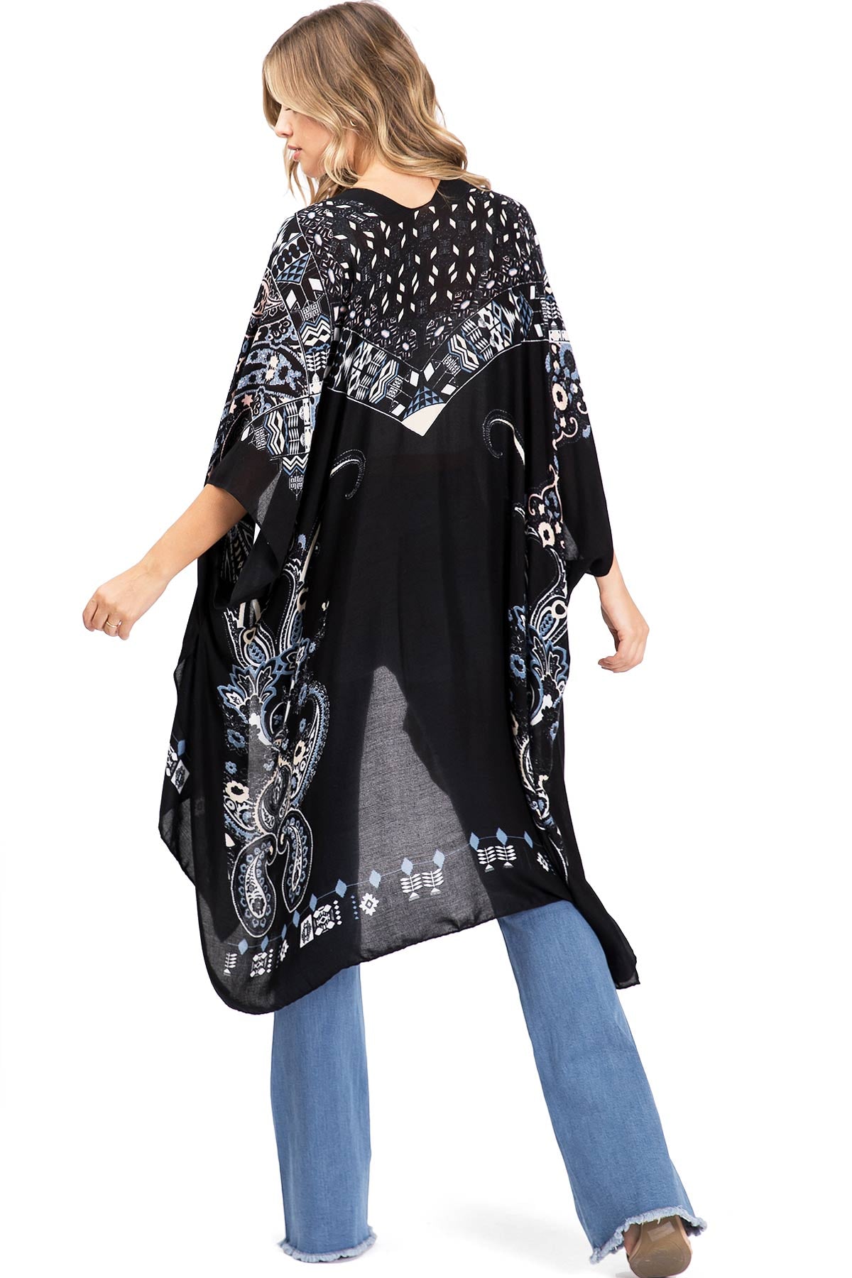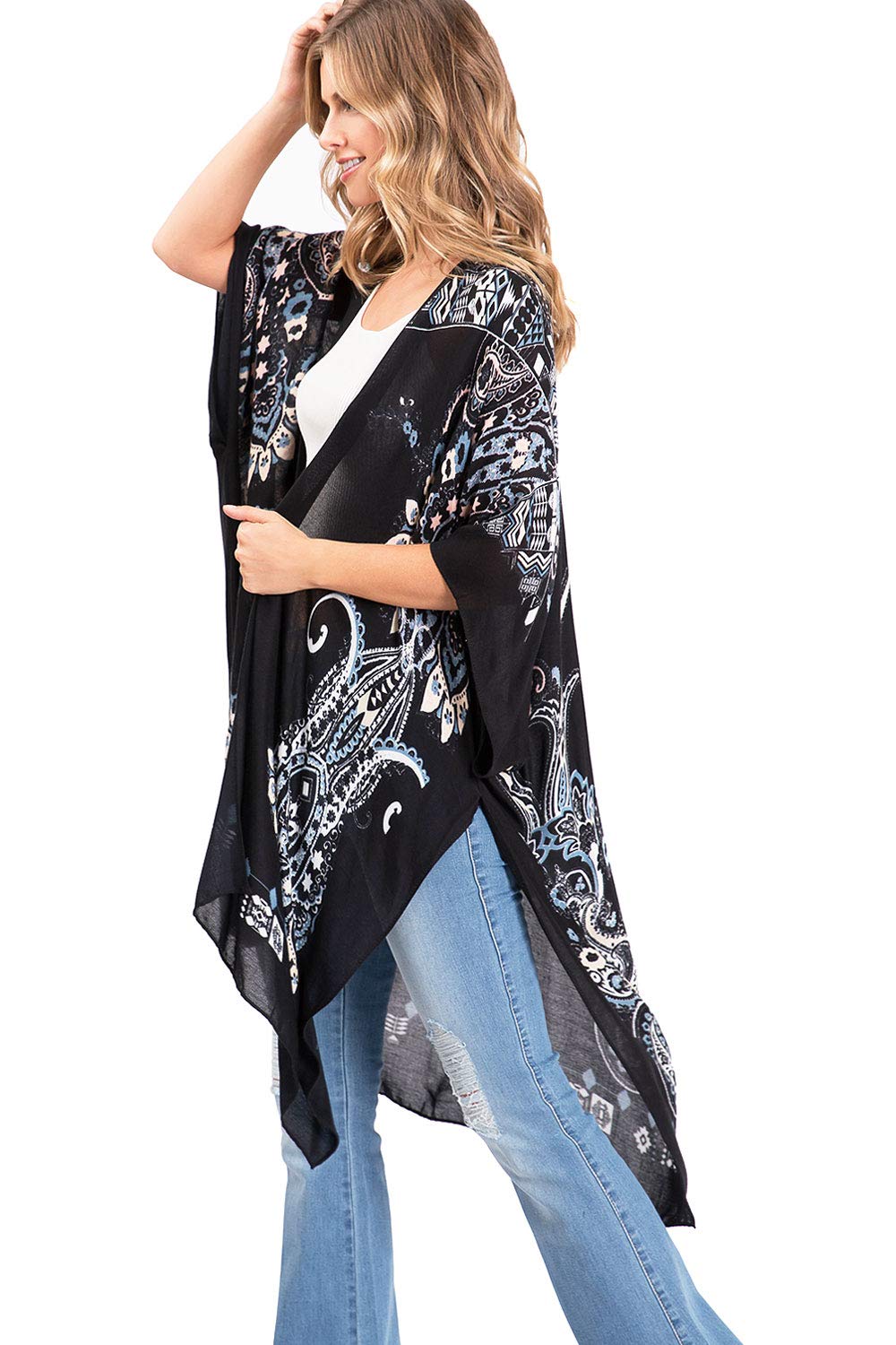 Printed lightweight cardigan, with split on sides and an open front style with an asymmetrical length. Dropped?sleeves and sheer fabric. Looks great layered over casual outfits.