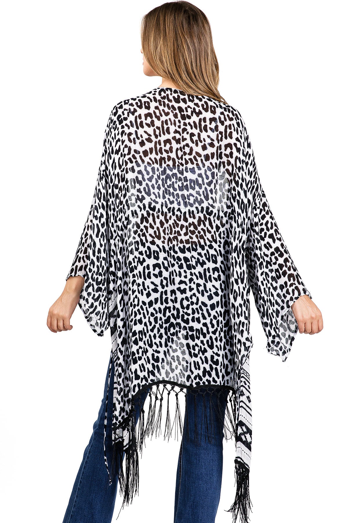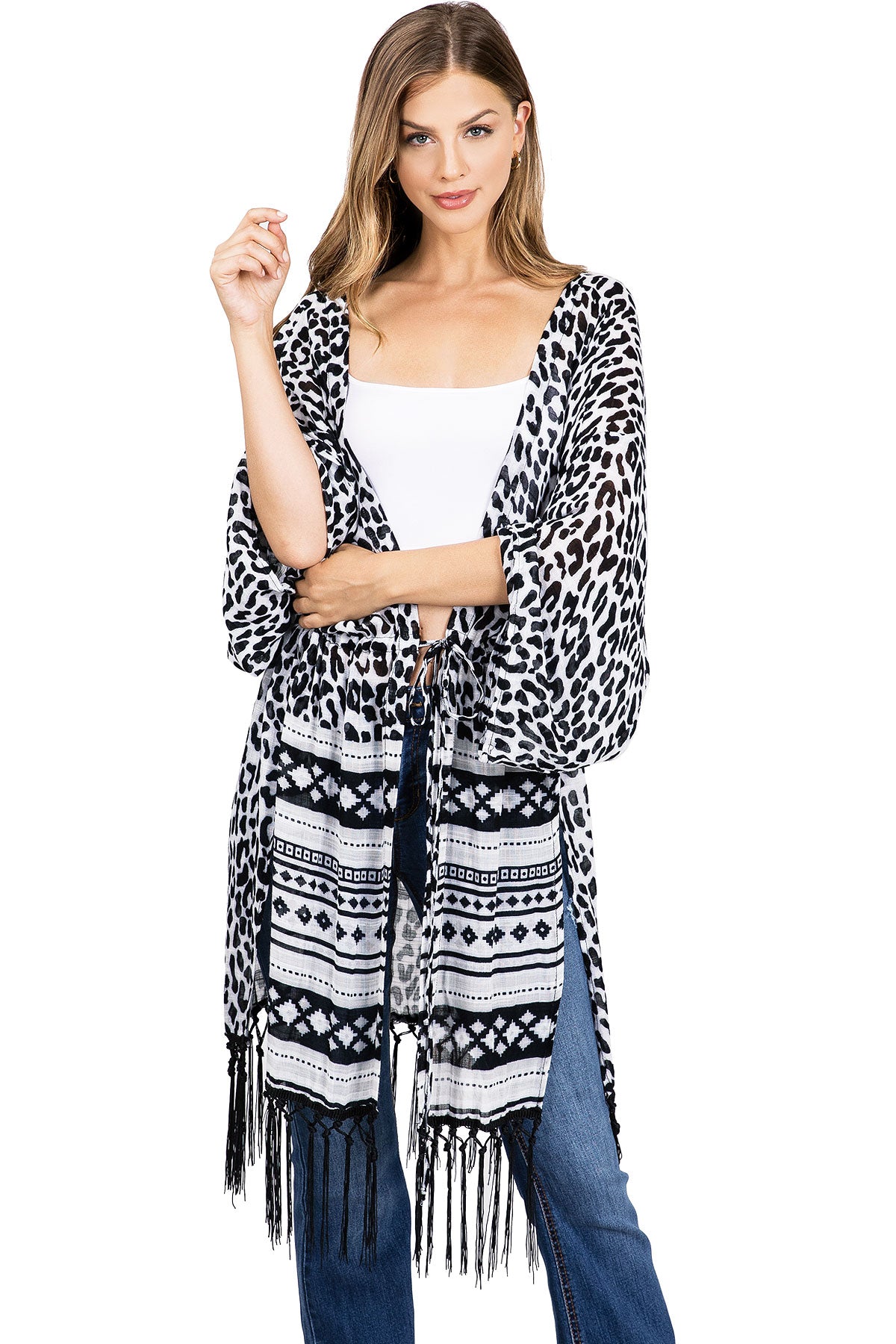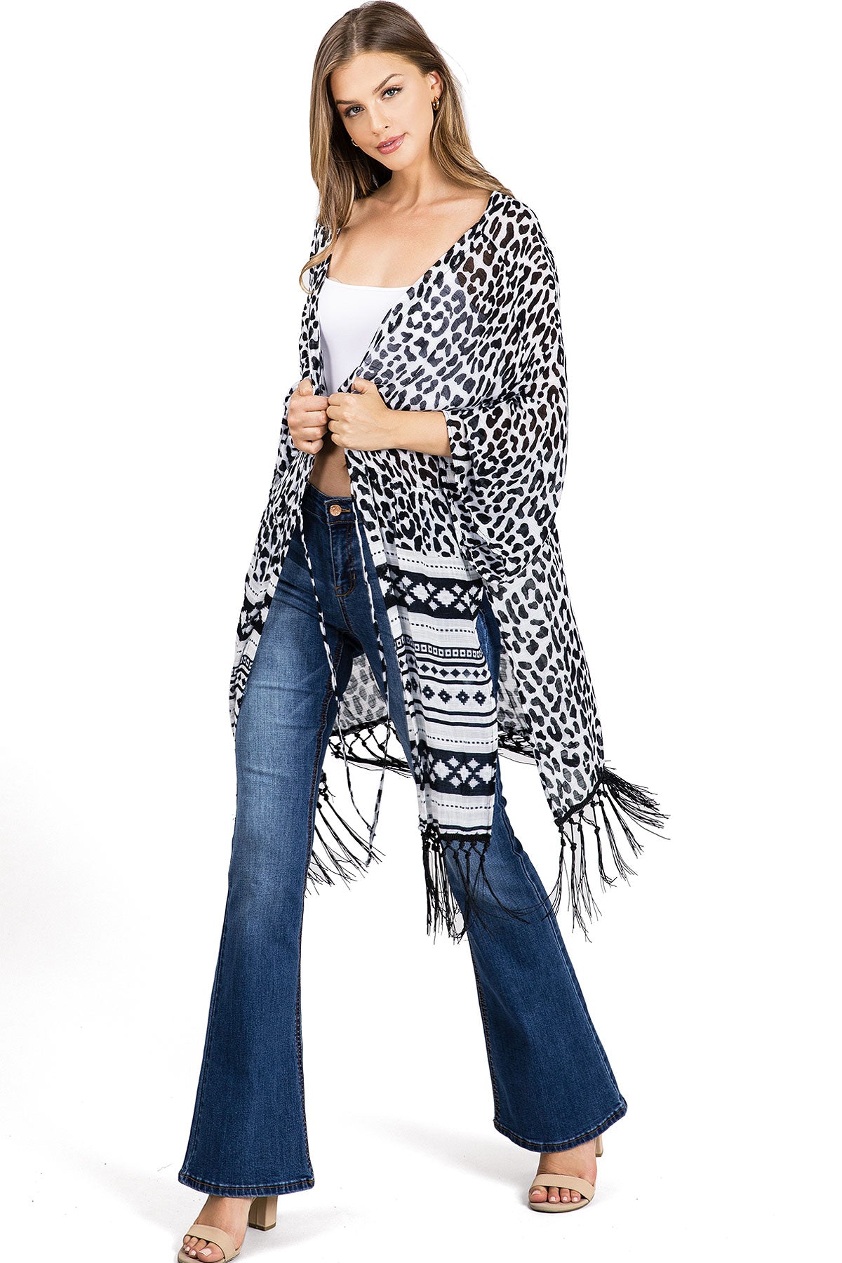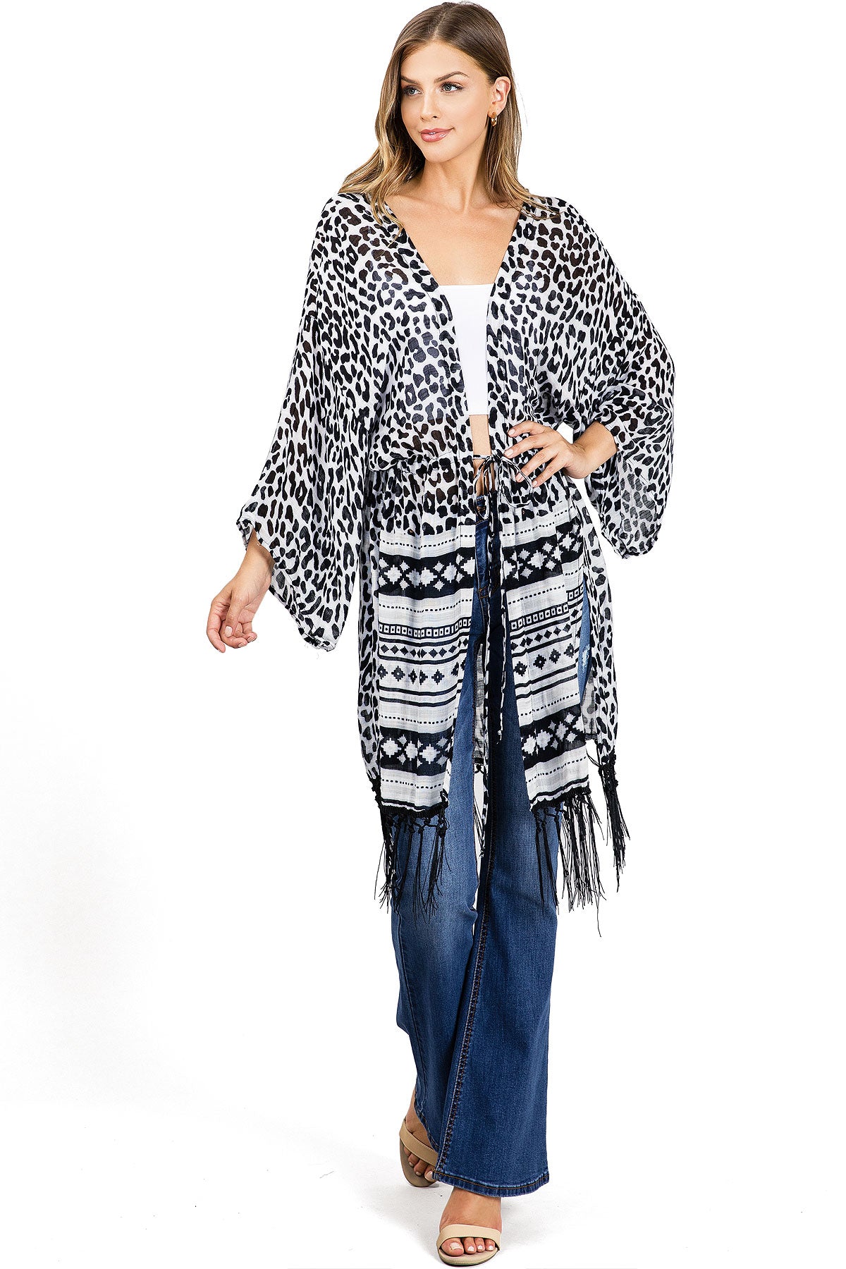 Robe style kimono with leopard and boho prints, long 3/4 length bell sleeves and a self-tie closure at the waist. Split sides and fringe tassels along the bottom edge finish off this stunning design. Light and easy to pair over any casual outfit!